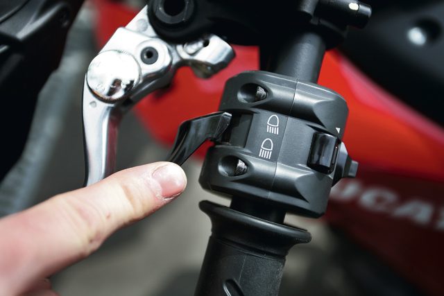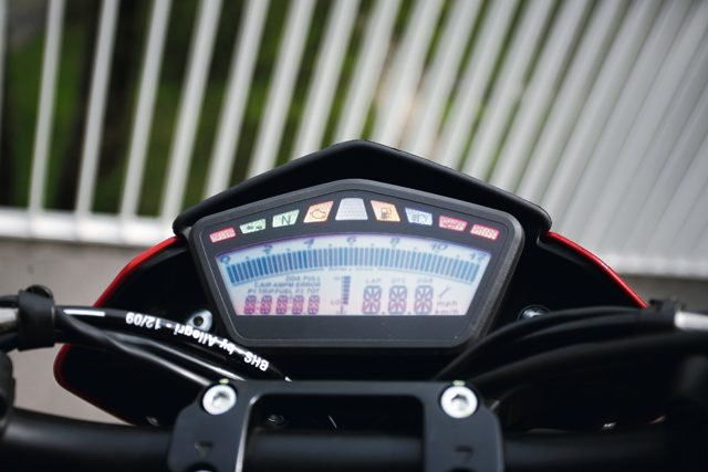 Akceptując styl tego motocykla nie ma więc co narzekać na ciekłokrystaliczny, wielofunkcyjny wyświetlacz. Zawiera on między innymi: prędkościomierz, obrotomierz, licznik przebiegu całkowitego i dwa dzienne, laptimer oraz rzadko spotykane funkcje, takie jak wskaźnik temperatury oleju, woltomierz, czy przypomnienie o konieczności zrobienia przeglądu serwisowego. Ciekawym dodatkiem znanym ze sportowych maszyn włoskiego producenta jest – DDA, czyli Ducati Data Analizer. System, który w dużo bardziej zaawansowanej formie stosowany jest w MotoGP, pozwala z pomocą specjalnego adaptera przenieść na komputer takie dane jak prędkość, czasy okrążeń, obroty silnika czy stopień otwarcia przepustnicy. Kontrastem dla wyświetlacza są umieszczone nad nim staroświeckie kontrolki. Gdzie ja to widziałem? Tak, autobus Ikarus! Wszystkie funkcje tablicy wskaźników można wybierać bez odrywania rąk od kierownicy. Do pełni szczęścia brakuje tylko odrobinę lepszych plastików użytych na obudowy i same przełączniki. Te wyglądają po prostu „tanio”.