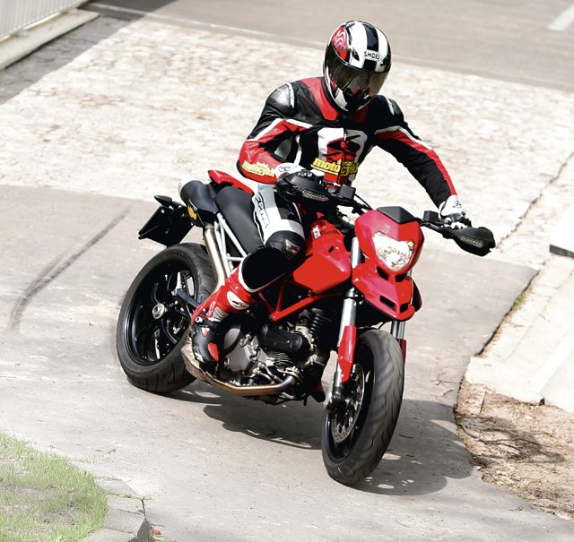 To nie miasto, a kręte drogi są rajem dla tego motocykla. Sztywna kratownicowa rama i dopracowane zawieszenie pozwalają poczuć się pewnie na winklach. Hypermotard prowadzi się neutralnie i lekko. Mocny w średnim zakresie obrotów silnik pozwala na szybkie przyspieszenie pomiędzy kolejnymi zakrętami, bez konieczności częstego mieszania dźwignią zmiany biegów. Nie można też narzekać na przedni hamulec pochodzący z renomowanej firmy Brembo. Jest on odpowiednio skuteczny, a zarazem niezbyt czuły. Klamka wymaga większego nacisku, ale dzięki przewodom w stalowym oplocie można bardzo łatwo dozować siłę hamowania. Za to zdecydowanie za słaby jest tylny układ. By zablokować tylne koło, trzeba niemal stanąć na dźwigni, co w motocyklu tego typu jest przecież przydatne.