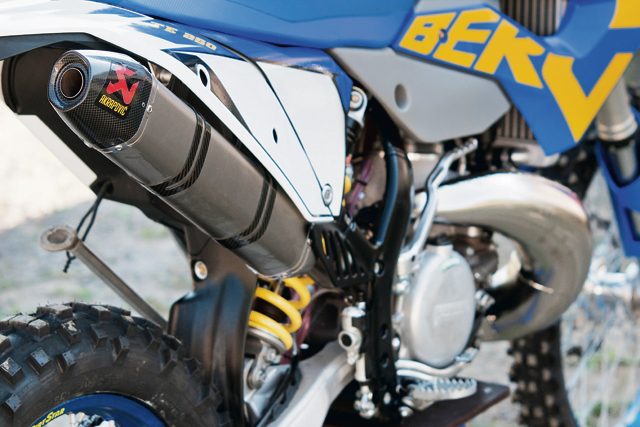 TE300 to model niemal identyczny z TE250. Różni się jedynie tym, że ma zdecydowanie większy moment obrotowy. Jak w 250 „dół” był słaby, tak tutaj jest zadziwiająco mocny. Wzrost mocy maksymalnej jest mało odczuwalny. Może to właśnie dzięki mniejszej dysproporcji mocy w dolnym i górnym zakresie obrotów? Modele TE także są wyposażone w zmienne mapy zapłonu, tym razem dwie. Różnica po ich przełączeniu jest jednak nieznaczna, dla wielu będzie wręcz niezauważalna. Ciekawą rzeczą wydaje mi się możliwość wymiany sprężyny zaworu wydechowego, dzięki czemu można zmieniać charakterystykę silnika zgodnie z indywidualnymi upodobaniami. W modelach TE, tak jak w FE i FX, został zamontowany rozrusznik, który wedle zapewnień producenta waży tylko 1,5 kg i według mnie jest to już chyba niezbędne wyposażenie każdego motocykla enduro.