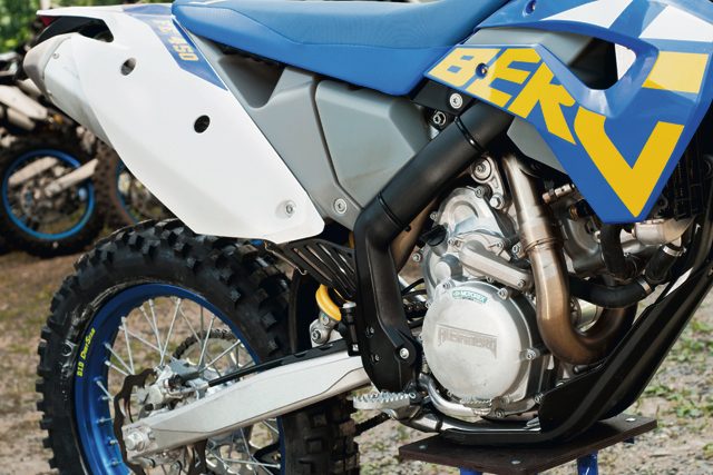 Husaberg jest własnością KTM-a – to powiązanie widać już na pierwszy rzut oka. Hydrauliczne sprzęgło Magura, hamulce Brembo, stalowa rama, tylne zawieszenie PDS… Nie można się pomylić. I nie ma się czego wstydzić, gdyż są to rozwiązania dobre i sprawdzone. W końcu KTM jest marką cenioną w enduro. Jednak to nie wszystko. O Husabergu mówi się „born in Sweden, produced in Austria”, a to dlatego, że Austriacy dają sporą swobodę szwedzkim inżynierom. Dzięki temu w ich motocyklach możemy zauważyć wiele innowacji i ciekawych rozwiązań, zwłaszcza w czterosuwowych modelach. Weźmy chociażby silnik. Wygląda, jakby ktoś go odwrotnie zamontował. Cylinder jest pochylony pod kątem aż 70 stopni. Dzięki temu jego obracające się masy są dużo bliżej środka ciężkości motocykla, co przekłada się na łatwość prowadzenia. Filtr powietrza znajduje się w miejscu, gdzie spodziewalibyśmy się zbiornika paliwa. Ten jest przesunięty niżej i trochę do przodu.