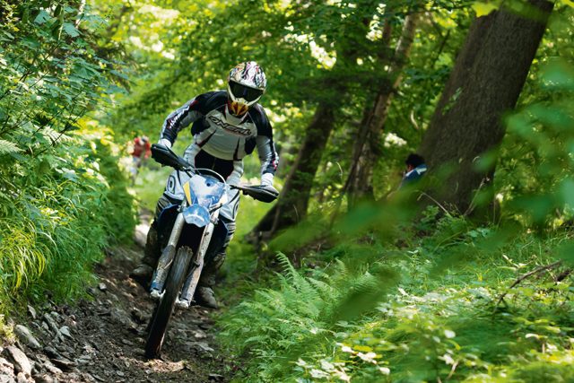 Przygotowana próba w większości znajdowała się w lesie. Jeden dość długi podjazd po kamieniach, równie długi zjazd i raptem kilka zakrętów na łące. Uznaliśmy tę trasę za wymagającą poprawek i przedłużyliśmy odcinek na łące, dzięki czemu mogliśmy lepiej poznać charakterystyki silników testowanych motocykli, bo tutaj było najwięcej różnic.FE 390 to najmniejszy z zaprezentowanych czterosuwowych modeli. W zamyśle konstruktorów miał być to motocykl łatwy do opanowania, dobry dla początkujących, jednak zadowalający także dla bardziej wymagających jeźdźców. Muszę przyznać – udało im się to bardzo dobrze. Silnik w dolnym zakresie obrotów jest łagodny i przyjazny. Motocykl sprawia wrażenie potulnego jak baranek. Dzięki wspomnianym już modyfikacjom główki ramy i nowym przednim widelcom, prowadzi się lekko, łatwo i precyzyjnie. Zabawa jednak zaczyna się dopiero po osiągnięciu wyższych obrotów. Wtedy motocykl nabiera werwy. Moc oddawana jest jednak w sposób liniowy i przewidywalny, a przez to łatwy do opanowania. Pomimo papierowych danych sprawia wrażenie lżejszego i poręczniejszego niż reszta rodziny FE. Bardzo przyjemny motocykl, który potrafi dać dużą przyjemność z jazdy zarówno początkującym, jak i bardziej zaawansowanym jeźdźcom.