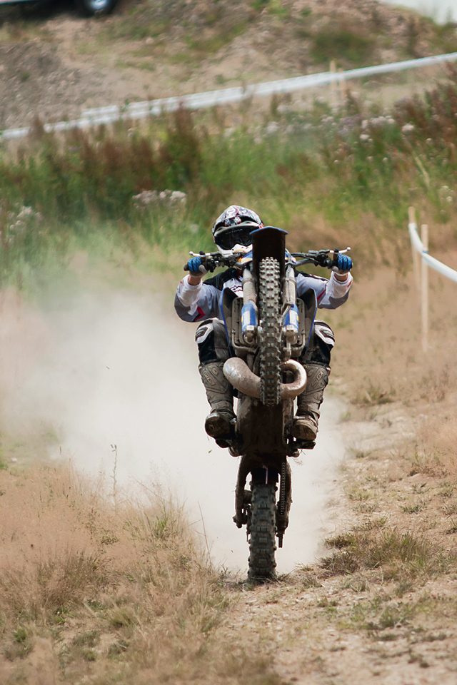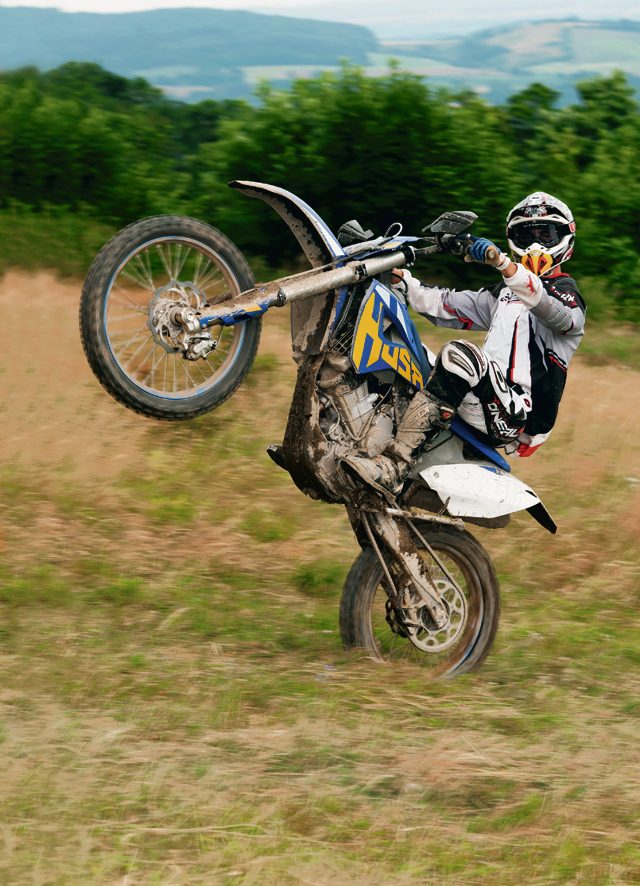 FE 450. Propozycja Husaberga dla startów w klasie E2. Od samego początku można poczuć, że jest to większy brat FE390. Podwoziowo jest bardzo podobny, również prowadzi się precyzyjnie i świetnie hamuje, chociaż sprawiał wrażenie nieco cięższego. Silnikowo – czuć spory wzrost mocy i jeszcze większy wzrost momentu obrotowego. Silnik ciągnie równo, acz zdecydowanie i to już od najniższych obrotów. FE 570 to chciałoby się rzec „Big Daddy”. Największy przedstawiciel rodziny FE. Ten motocykl wymaga już od jeźdźca dobrej kontroli nad prawym nadgarstkiem. Posiada duże rezerwy mocy i cały ogrom momentu obrotowego. Ponadto sprawiał wrażenie najbardziej ociężałego, mimo że na papierze jest tylko pół kilograma cięższy od FE390 i FE450. Na ciasnych i precyzyjnych odcinkach odniosłem wrażenie, że jest tego już za dużo. Motocykl aż zbyt ochoczo wyrywał do przodu przy nawet drobnym ruchu manetką.