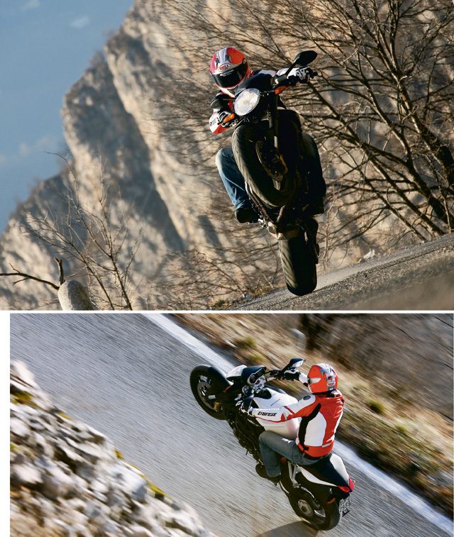 Jest prawdopodobnie najbardziej poręcznym nakedem, jaki kiedykolwiek zszedł z linii montażowej w Schiranna. W trakcie tego testu, przeprowadzonego na krętych drogach z ostrymi zakrętami, nieustannie zadawaliśmy sobie pytanie, jak jest możliwe osiągnąć taki wynik przy porównywalnej wadze i walorach jezdnych. Pomijając już fakt, że same obręcze zwiększają masę o 1,5 kg, oraz wszelkie konsekwencje wynikające z efektu żyroskopowego. A jednak 920 pozwala skręcać, zmieniać kierunek jazdy ze zwinnością łasicy. Czyżby podstawili nam B3 – to było pierwsze podejrzenie… rozwiane natychmiast mocą silnika. Najwyraźniej tylna guma 180/55 (choć homologację przeszedł także rozmiar 190) oferuje taką chyżość, która przekracza najśmielsze oczekiwania. Jednak w naszej opinii, najbardziej przyczyniła się do tego dieta odchudzająca, jaką zastosowano w stosunku do przedniej lampy, zawieszonej na kierownicy.