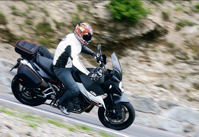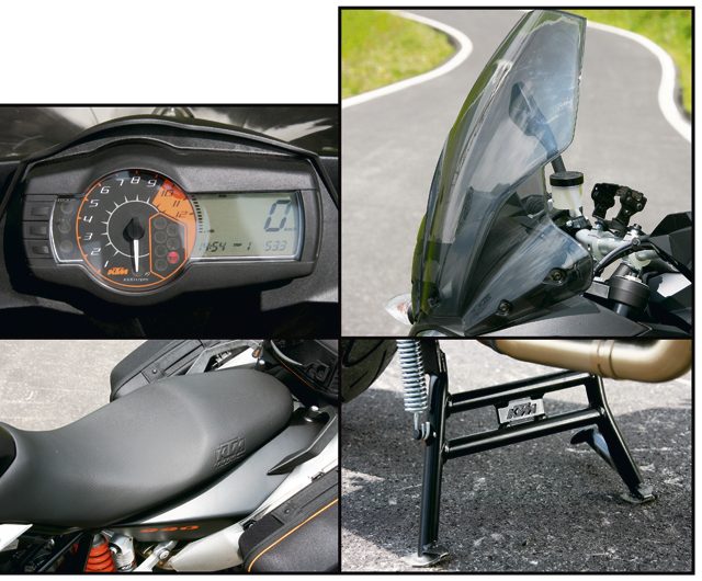 Bardzo ładnie wypracowano trzy półsztywne kufry KTM, choć są mało pojemne i o nieregularnym kształcie. Ich całkowita pojemność wynosi około 25 litrów, czyli o 4 mniej niż w Ducati. Tablica przyrządów jest wyrazista i wręcz prosta. Poza klasycznym zestawem informacji wskazuje także przebieg na rezerwie oraz temperaturę otoczenia. Brak wskaźnika poziomu paliwa, jakże przydatnego w motocyklu podróżnym. Powiększona przednia szybka, podobnie jak wszystkie akcesoria montowane w wersji Limited Edition, jest uwzględniona w katalogu Powerparts KTM. Wygodne są pokrętła regulacji w górnej części widelca. Umieszczone nieco wyżej śrubki występujące na obydwu lagach, służą za odpowietrzenie. Siodło „ergo” – kolejna część wyjęta z katalogu, ma tapicerkę dostosowaną do długich tras. Centralna podstawka jest seryjna jedynie wersji Limited. Schowek pod kanapą, choć nie tak uporządkowany jak w Ducati, jest pojemny i zawiera bogaty zestaw narzędzi. Wspornik nawigacji GPS stanowi wyposażenie tej wersji. Jest on połączony z gniazdkiem elektrycznym, usytuowanym obok stacyjki.