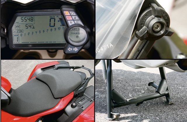 Tablica przyrządów należy do najbardziej estetycznych, czytelnych i kompletnych. Ilość informacji umożliwia swobodną jazdę pod pełną kontrolą, wśród licznych zalet warto podkreślić: odczyt zasięgu, średniego i bieżącego zużycia paliwa, czasu podróży, włączonego trybu pracy silnika, obciążenia motocykla, zadziałania układu. Niestety tachometr jest mało precyzyjny, wskazywane 130 km/h odpowiada w rzeczywistości 119 km/h.