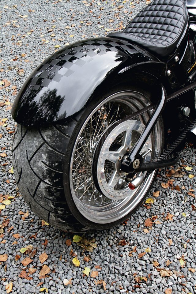 Montaż tak potężnego tylnego koła wymusił zastosowanie odsadzonej zębatki zdawczej. Do linii motocykla znakomicie pasuje smukły zbiornik paliwa pochodzący z oferty Zodiaca. Szeroka kierownica drag bar i wysunięte do przodu podnóżki pozwalają przyjąć wygodną pozycję za sterami. Silnik przeszedł tylko drobne zabiegi upiększające polegające na wypolerowaniu bocznych dekli.