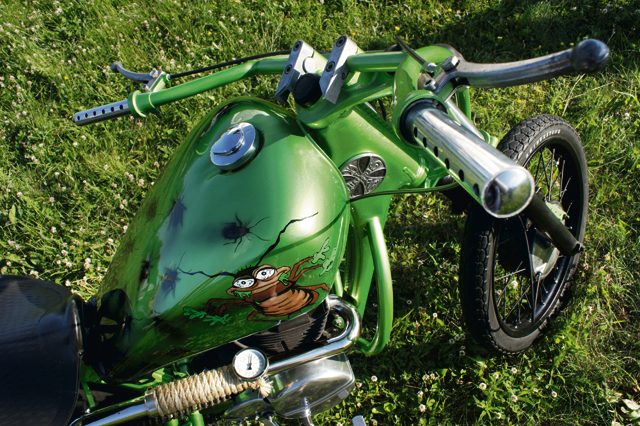 Po krótkiej rozmowie z Juniorem można dojść do prostego wniosku, że wszystko co robisz, musi pozostawić po sobie trwały ślad na psychice widza.Siodło wraz ze zbiornikiem swoimi obszernymi  kształtami przypominają pancerz karalucha. Motocykl pokryto lakierem nazywanym Apple Green, skomponowanym przez Billa Gatesa. Na bazę nałożona została aerografia wykonana przez firmę Gangsta Bikes. Wszelkie dodatki umoczone są w czarnym macie, tak samo jak głowica i cylinder. Te dwa czarne elementy przewijają się w niemalże każdym projekcie Juniora. Uwagę należy również zwrócić na ciekawe dodatki jak ręcznie rzeźbiony bęben czy logo PC na główce ramy. Nawet we wlew oleju został wkręcony dość nietypowy korek z zaprzyjaźnionego Związku Radzieckiego.