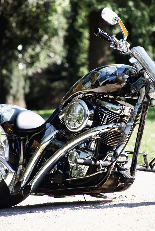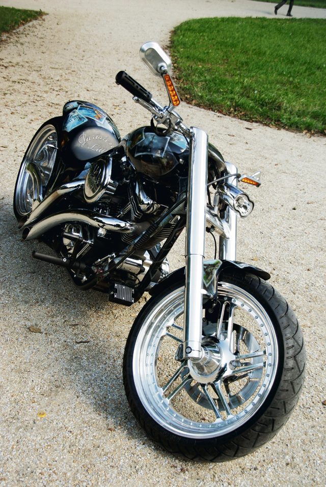 Jak chcecie – może być to bogini seksu. A może po prostu wizerunek wszelkich cnót kobiecej natury. Do końca nie wiadomo, ale wygląda pięknie. Damska subtelność stanowi kontrę dla ciężkiej, długiej i nierealnie obniżonej sylwetki maszyny. Znakomicie kontrastuje z błyszczącym techniczną muskulaturą dwucylindrowym silnikiem, amerykańskim RevTech. Jego monumentalny blok ma 1850 ccm pojemności (110 cali) i pompuje moc, która wymieszana z adrenaliną, nawet w dosiadającym maszyny chłopcu ukaże mężczyznę. Tuż za silnikiem zainstalowano pięciobiegową przekładnię tej samej marki, z mokrym sprzęgłem i szczelnie zabudowanym pasem transmisji mocy, która tą właśnie drogą płynie szerokim strumieniem od wału korbowego do skrzyni. Całość pracuje na offsecie dystansującym, ze względu na niebagatelną szerokość tylnego koła.