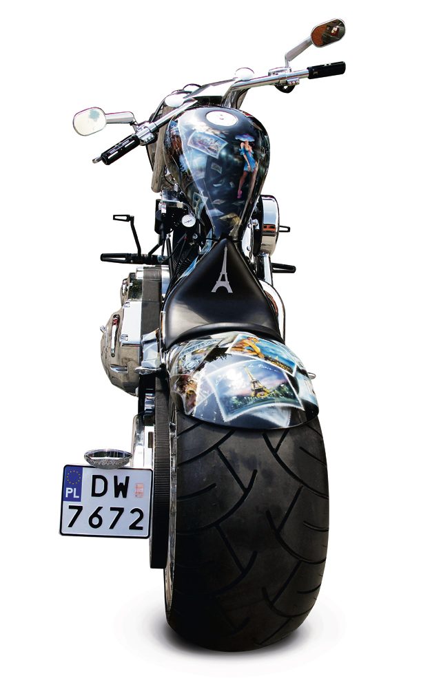 Dlatego taka okazja zdarza się niezwykle rzadko: popatrzeć z bliska, posłuchać pracy silnika Małej Paryżanki, a potem zobaczyć, jak jeździ cwałem przed siebie. We wrocławskiej Appaloosie – lokalnej „Mekce” wyznawców maszyn spod znaku HD, spotykam właściciela i jeden z jego trzech nietypowych motocykli. O dziwo, nie ma zbyt wiele słów do powiedzenia. Nie chce i nie musi, bo za niego każdym swoim detalem przemawia motocykl. Nawet kiedy spokojnie stoi i stygnie, a jego metaliczna dusza nie wydaje żadnego dźwięku. Opalizujący lakier wyłania pocztówki z Paryża rozrzucone w artystycznym nieładzie po całym motocyklu, jest też sylwetka subtelnej kobiety.