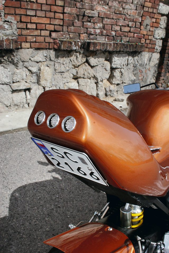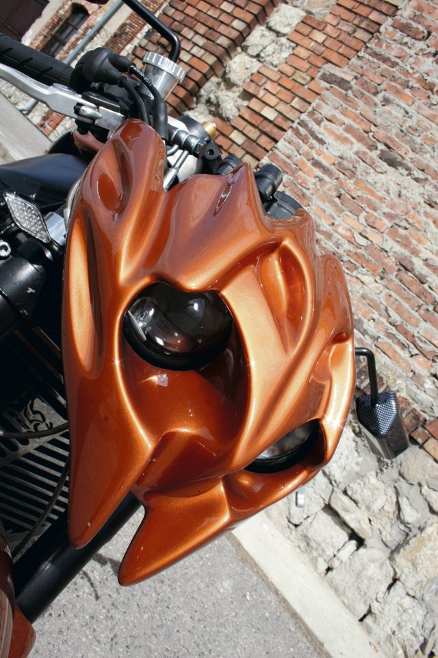 Pierwsze, co rzuca się w oczy, to nowe elementy karoseryjne. Komponenty użyte do restylingu motocykla pochodzą po części z ofert specjalistycznej niemieckiej firmy Bimbos, po części są produktem polskiej firmy Plast Bikes, a po części autorskim dziełem Urko Fighter. Z oryginalnej owiewki pozostał jedynie dolny fragment, który odpowiednio przystrzyżono i wymodelowano, by dobrze pasował do nowej stylizacji motocykla. Zastosowanie zadartego do góry „zadupka” ze spartańskim, wyciętym z blachy „siodłem” wymagało usunięcia oryginalnej tylnej części ramy i wykonania nowego subframe. Trzeba też było wygospodarować nowe miejsce na akumulator i elektroniczne podzespoły. W streecie jest znacznie mniej miejsca na ukrycie wszelkich kabli i całej elektroniki niż w motocyklu seryjnym, a zatem również montaż groźnie wyglądającej czachy z soczewkowymi światłami nie ogranicza się do prostego zastąpienia seryjnych elementów tuningowymi.