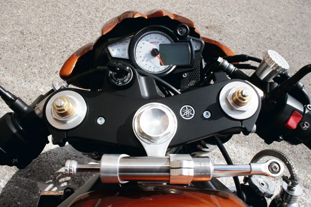 Adam nie chciał w swoim sprzęcie zmieniać kierownicy na wyższą i szerszą, gdyż seryjna pozwala przyjąć pozycję bardziej sprawdzającą się przy szybkiej jeździe i częstym wykorzystywaniu potencjału tkwiącego w silniku. Wymieniono za to podnóżki. Nowe, pochodzące z Lucasa, nie tylko ciekawiej wyglądają, ale też pozwalają lepiej czuć motocykl i umożliwiają szeroki wachlarz regulacji dźwigni. By motocykl prezentował się atrakcyjnie, chłodnicę osłonięto chromowanym grillem własnej roboty. Gumowe węże systemu chłodzenia zastąpiono odpowiednikami w stalowym oplocie, a rolę zbiornika wyrównawczego przejęła aluminiowa butla. Również zbiorniczki płynu hamulcowego wymieniono na aluminiowe.