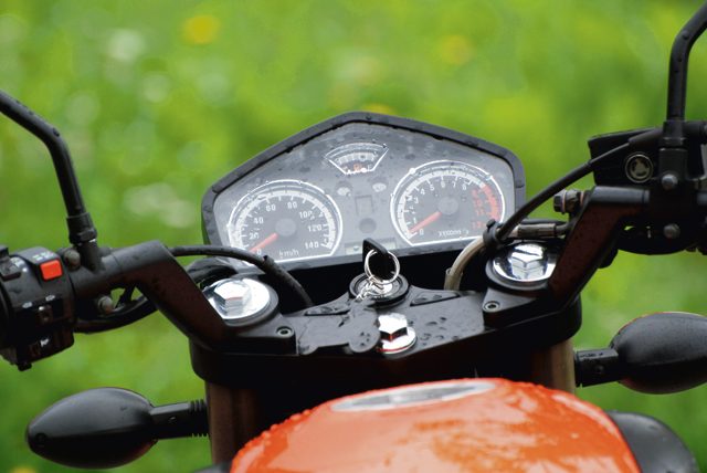 Kolejny etap zapoznania się z maszyną wypadł odrobinę gorzej. Podczas dokładnych oględzin szybko znajduje się mankamenty. Przełączniki na kierownicy niby są przemyślane i dobrze rozmieszczone, ale brak im najważniejszego – jakości. Są twarde, nieprzyjemne w dotyku i mają mnóstwo luzu, przez co wciąż zmieniają pozycję. Na szczęście wszystko działa, mniej lub bardziej delikatnie. Puszka z zegarami wygląda bardzo dobrze. W ramach gadżetów warto wspomnieć o wyświetlaczu biegów oraz wskaźniku paliwa podświetlanym kolorowymi lampkami. Niestety w słoneczne dni na żadnym z nich nic nie widać. Zegary kryją jeszcze jedną niespodziankę znaną z motocykli japońskich – przy włączeniu zapłonu resetują się, świecąc i poruszając wszystkim, co tylko w sobie mają.