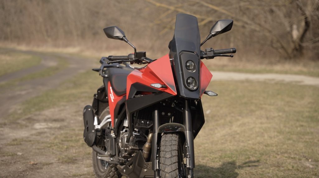 Widać inspirację stylem KTM i „Dakarówek” – agresywny przód, duży bak i wąska szyba, w połączeniu z szeroką kierownicą dodają charakteru i na pewno przyciągną wzrok.