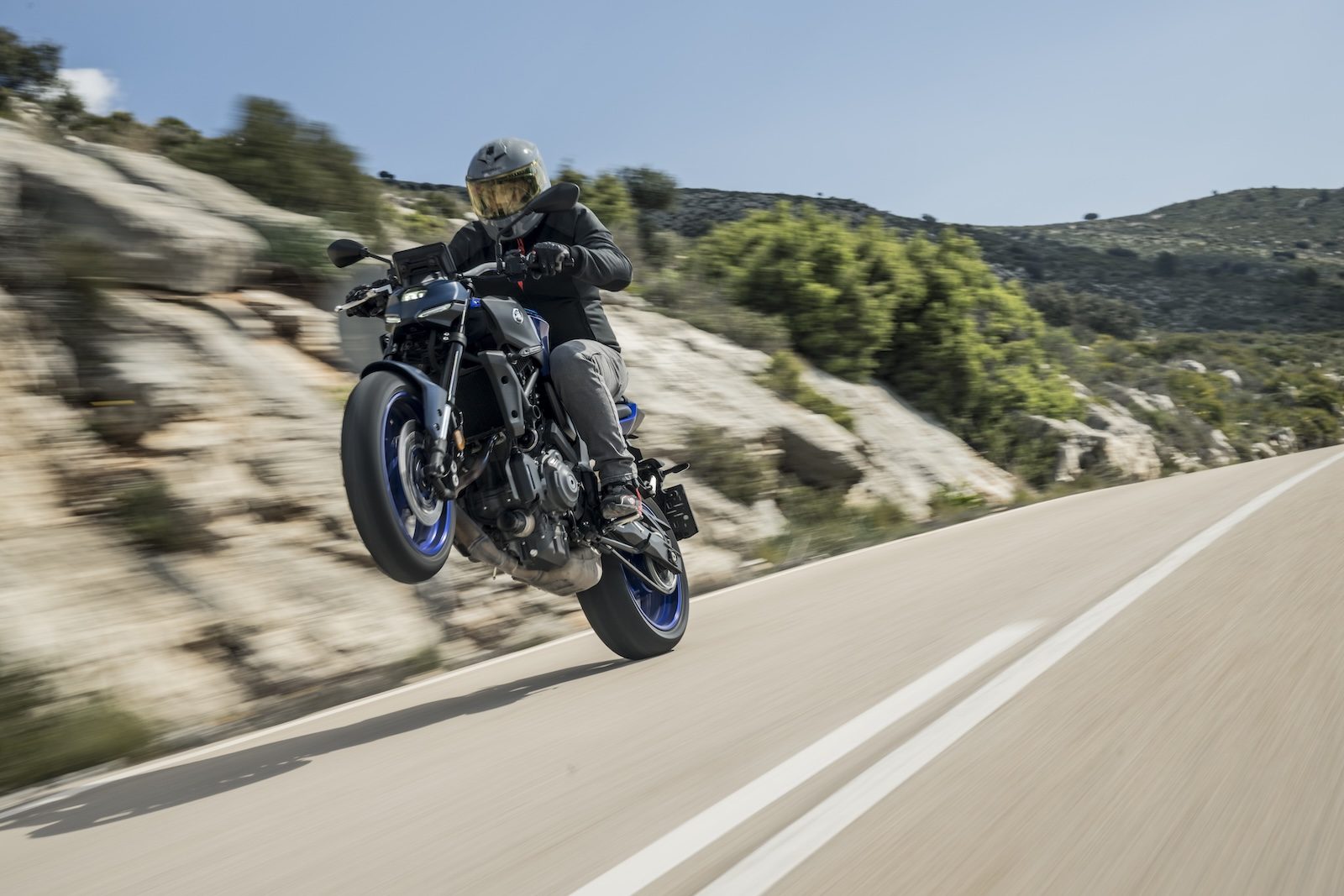 Jeżeli ładnie poprosisz prawym nadgarstkiem, to MT-07 Y-AMT podniesie przednie koło i utrzyma je w powietrzu. Wtedy zorientujesz się, że zmiana biegów na gumie nigdy nie była łatwiejsza, niż za pomocą sprytnego przycisku kołyskowego plus/minus pod lewą manetką.