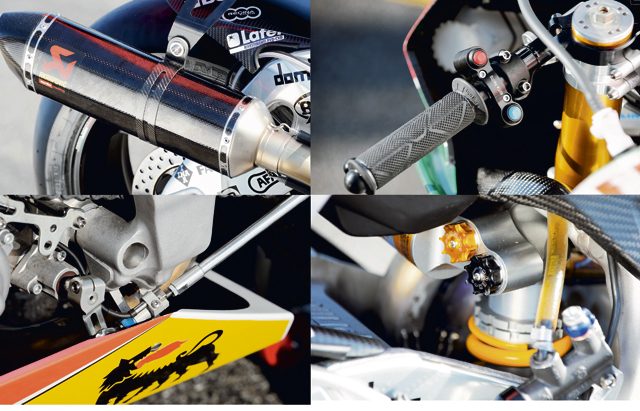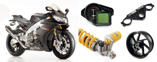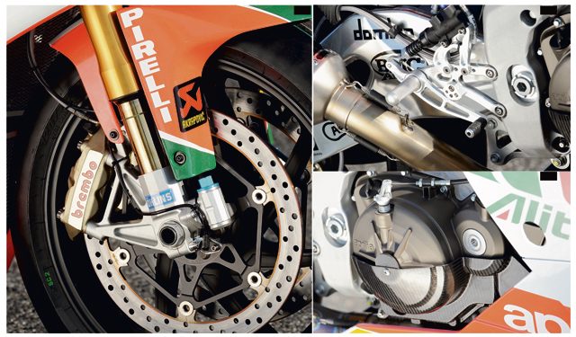 Widelec upside-down o skoku 120 mm pochodzi z fabryki Öhlinsa. Tablica przyrządów została zmodyfikowana, by poprawić widoczność podczas jazdy wyścigowej. Gdy układ sterowania trakcją wchodzi do akcji, zaczyna pulsować żółta kontrolka. Układ APRC Aprilli został opracowany w ramach intensywnej współpracy z grupą badawczą „MOVE” Wydziału Elektroniki i Informacji Politechniki w Mediolanie, specjalizującą się w elektronicznych układach sterujących do pojazdów. Opracowane układy, wykorzystujące najbardziej zaawansowane techniki automatycznego sterowania i parametrycznego szacowania zostały opatentowane (trzy niezależne patenty, każdy odnoszący się do konkretnego modułu układu). Jest to rzadki przypadek tak intensywnej współpracy pomiędzy producentem motocykli a placówką naukową, w wyniku której powstał awangardowy produkt przyczyniający się do zwiększenia konkurencyjności włoskiego przemysłu w oparciu o nowatorstwo technologii.