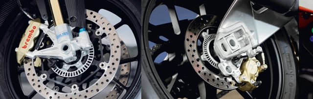 Kolaudatorzy Aprilii obecni na torze w Jerez de la Frontera, teatrze testów dla prasy, zapewniają, że czas przejazdu uległ zasadniczej poprawie. Kilka dziesiątych sekundy dla najlepszego okrążenia i ponad sekundę na prostej. Testując APRC także na torze w Monza stwierdziliśmy, że korzyści są ewidentne, zarówno na torze, jak i na drodze. Wynika to z faktu, że kontrola trakcji reaguje nie tylko na ewentualne błędy kierowcy, ale także wpływa na zużycie ogumienia. A propos opon. Założono tu rewelacyjne dwumieszankowe Pirelli Diablo Supercorsa SP (pochodna Pirelli SC z MŚ Supersport). W wyścigach RSV4 dała już szereg dowodów, że nie obawia się konkurencji. Ostatnie wydanie RSV4 jest również dość wszechstronne, pod warunkiem, że dobór układu sterowania trakcją (ATC) z ośmioma nastawami oraz system AWC zapobiegający jeździe na gumie z trzema możliwościami regulacji trafi na kierowcę potrafiącego wykorzystać ich potencjał. Doświadczeni kierowcy powinni skalibrować ATC pomiędzy 1 a 3, a AWC na 1. Aby zapewnić wystarczający komfort, dobry kierowca powinien ustawić ATC pomiędzy 4 a 5 oraz AWC na 2. W przypadku nowicjuszy (lub mokrego asfaltu) lepiej optować za ATC pomiędzy 6 i 8 oraz AWC na 3.