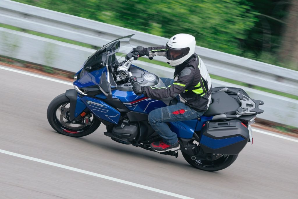 Wysoka przednia szyba jest oczywiście regulowana elektrycznie, podobnie jak w poprzedniku. Teraz możemy jednak zmieniać nie tylko wysokość szyby, ale też położenie dużych bocznych paneli. Do wyboru są dwa ustawienia owiewek i w tym przypadku regulacji dokonujemy ręcznie. W ich dolnym położeniu więcej powietrza opływa tułów kierowcy, co będzie dobrym rozwiązaniem na gorące dni. Po przesunięciu paneli w górne położenie, ochrona przed wiatrem czy deszczem znacząco wzrasta. To jednak nie koniec udogodnień związanych z dopracowaną aerodynamiką. Okazuje się, że świetną robotę robią też niepozorne owiewki zamontowane w okolicach wystających na boki cylindrów. Zadaniem tych owiewek jest przede wszystkim ochrona przed wiatrem naszych stóp. Miałem okazję przetestować je, jadąc w ulewnym deszczu. Jakże wielkie było moje zdziwienie, kiedy zorientowałem się, że moje nogi od kolan w dół pozostały suche! Pakiet Komfort dla pasażera obejmuje nie tylko podgrzewane siedzenie i szersze podnóżki, ale również podgrzewane uchwyty do trzymania, a w połączeniu z centralnym kufrem nawet podgrzewane oparcie! Na zbiorniku paliwa umieszczono schowek na telefon, w którym znajdziesz gniazdo USB-C (zrezygnowano tu z ładowania indukcyjnego). Jeśli wybierzesz w konfiguratorze zestaw Audio lub Audio Pro, z głośników podczas jazdy będzie płynąć muzyka. Możesz słuchać Lata z Radiem albo po prostu odtwarzać ulubioną muzykę ze smartfona połączonego z motocyklem za pośrednictwem Bluetooth. Testowałem droższy system Audio Pro i w jego przypadku słuchanie muzyki przy prędkości nawet 130 km/h nie stanowi najmniejszego problemu. Kolejnym ciekawym rozwiązaniem, o którym warto wspomnieć, jest możliwość zmiany pojemności bocznych kufrów. Jeśli jeździsz po mieście, na pewno docenisz, że kufry nie wystają mocno na boki. Z kolei w trasie przyda się dodatkowa przestrzeń ładunkowa, którą uzyskujemy, poszerzając kufry.