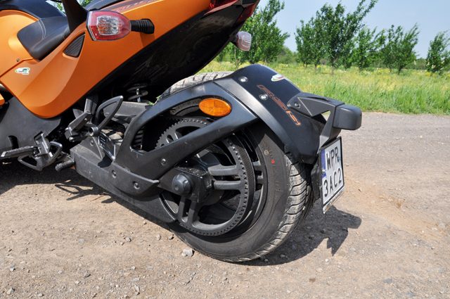 się tłumiącą interwencją elektroniki. Stanowczo za wczesną. Próba zarzucenia „ogonem” przez nagłe otwarcie przepustnicy po zatrzymaniu też spełznie na niczym. Informacja o minimalnie wychylonej kierownicy trafi do elektronicznego mózgu, który zaraz podetnie skrzydła krewkiemu driverowi. Nie sposób wpaść tym trójkołowcem w większe tarapaty. Oczywiście, jeśli w zakręt wpakujemy się stanowczo za szybko, cały pojazd efektownie będzie wynoszony. Znoszenie jest jednak równomierne i jeśli jezdnia jest dostatecznie szeroka, wyjdziemy na prostą bez przygód. Na pochwałę zasługują hamulce Spydera. Tu, inaczej niż w przypadku kontroli trakcji, elektronika nie wcina się zbyt wcześnie. Hamowanie na każdej nawierzchni najpierw powoduje krótkie piśnięcie opon, a dopiero potem włączenie ABS.