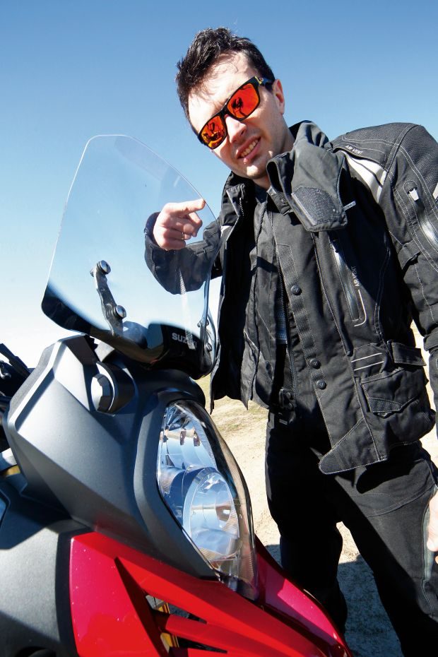 Od czterech lat jeżdżę starym, „małym” V-Stromem. Jeździłem też starym „dużym” i nowym „małym”. Na propozycję, by pojeździć też nowym „dużym” odpowiedziałem natychmiast głośnym „hura”! Widok mnie nie zaskoczył. Widziałem go już wcześniej. Przede mną stanął kawał motocykla, z ABS-em, kontrolą trakcji i zestawem kufrów. Wyglądał jak pisklę dinozaura: wiśniowy kolor, którego nie cierpię, szyba jak od prywaciarza i jeszcze aluminiowa płyta po silnikiem, która za kilka stówek z SUV-a ma zrobić terenówkę.