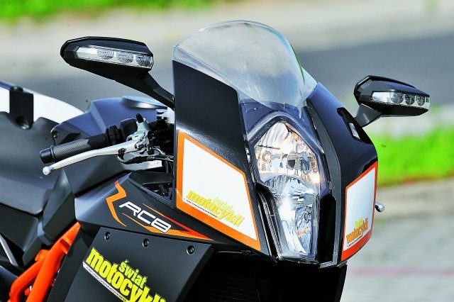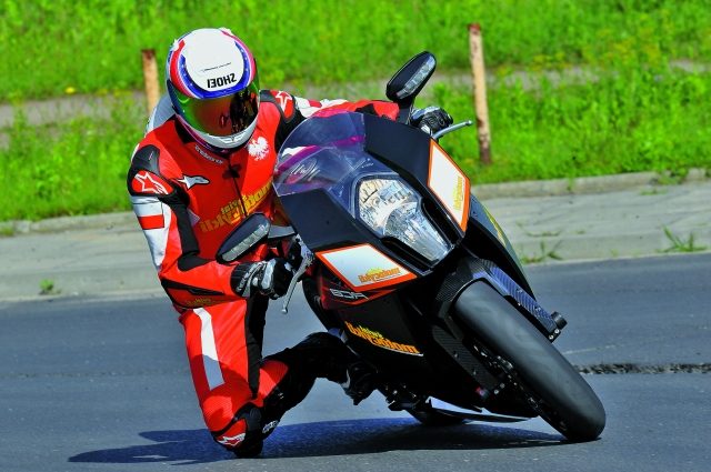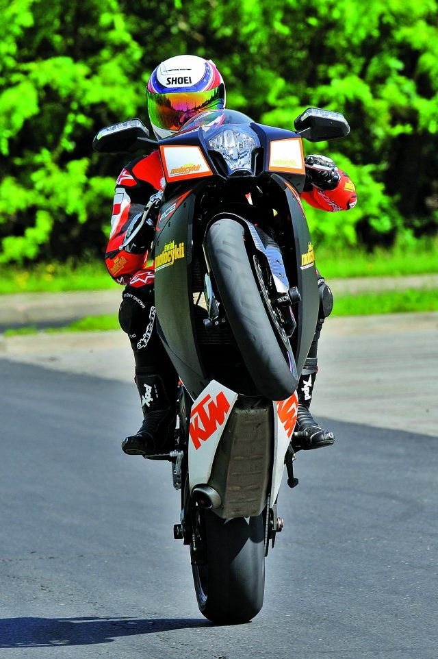 Normalna jazda w ruchu ulicznym mocno mnie zmęczyła. W dodatku potęgowało we mnie przeświadczenie, że KTM prowadzi się źle. Nerwowo i niepewnie. Zakręty pokonuje po wielokącie i trudno jest utrzymać zaplanowaną linię. Nie do końca miałem jasność, o co chodzi. Czy to może zbyt mocno skręcony amortyzator skrętu WP? Nie. Wszystko pracuje poprawnie. Więc co? Olśnienie przyszło dopiero wówczas, kiedy ruch mocno osłabł. Mimo dość brutalnego silnika KTM lubi właśnie takie traktowanie. Dopiero ?ogniem? jedzie dobrze. Tu trzeba po prostu złapać byka za rogi, nie dać się przestraszyć potencjałowi, jaki drzemie w RC8R. Motocykl można porównać do agresywnej rasy psa. Jeśli dasz się zdominować, to przepadłeś. Za to jeśli pokażesz, kto tu rządzi, nie znajdziesz wierniejszego przyjaciela. Silnik podkręcamy nieco wyżej, a zmiany biegów, wcześniej nieco oporne, przy wyższych obrotach i energiczniejszej zmianie pracują doskonale. Kolejne przełożenia zapinają się precyzyjnie, po szorstkiej zmianie pozostało tylko wspomnienie. Szkoda, że w tej wersji w standardzie nie występuje sprzęgło antyhoppingowe, dlatego trzeba niezwykle uważać przy redukcjach, mając dla spokoju dwa palce na klamce sprzęgła w przypadku zblokowania tylnego koła. A o to nietrudno, bo kompresja dwóch garów KTM potrafi wstrzymać je nawet przy bardzo wysokich prędkościach, a o wyświetlaczu biegów możemy tylko pomarzyć. Do hamowania zastosowano znany z RC8 zestaw hamulcowy Brembo z tą małą różnicą, że zastosowano tu grubsze o 0,5 mm tarcze hamulcowe. Do ich pracy nie mam zastrzeżeń. Warto przypomnieć, że wszystkie przewody hamulcowe są standardowo w stalowym oplocie. A jednak można, panowie „Japończykowie”!