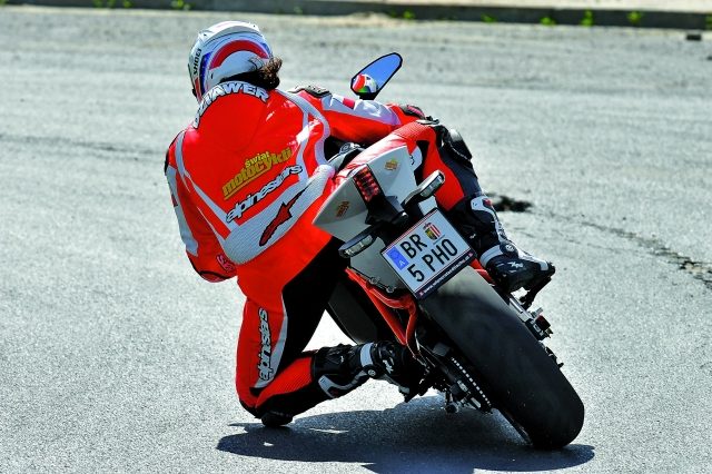 Na pierwszy rzut oka RC8R nie różni się wiele od swojego „cywilnego” brata, ale drzemie w nim o wiele większy potencjał. Stylistyka zdradza R-kę przez malowaną na pomarańczowo ramę. Wprawne oko wychwyci też inny fason kół od Marchesini, które w odróżnieniu od RC8 są odkuwane, a nie odlewane. To pozwoliło na dodatkowe obniżenie masy. Rama motocykla waży zaledwie 7,5 kg. W sumie RC8R jest lżejsza od RC8 o 2 kg. W katalogach figuruje jako motocykl jednoosobowy, ale każdy nabywca dostanie jako dodatek ekstra siodło pasażera i podnóżki. Prawdziwi koneserzy chyba nigdy nie wyjmą tych elementów z pudełka. Przednie zawieszenie R-ki pokryto azotkiem tytanu. Aby tylny wahacz pasował kolorystycznie, pomalowano go na czarno.