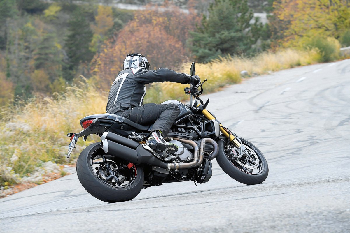 Niedostatki, o których wspomniałem, wynagradza nam nowa geometria. Sprawia ona, że Monster wpada w zakręty chętniej, niż kiedykolwiek wcześniej. Niemałe znaczenie ma „lekkość” pracy jednostki napędowej. Poprzednie Monstery trzeba było nieco zmuszać do posłuszeństwa w wolnych zakrętach, a ten, zamiast protestować, po prostu przerzuca się z jednego złożenia w drugie. Im szybciej jedziemy, tym jest lepiej. Żałuję, że nie mogliśmy jeździć wersją podstawową. Sądzę, że na nierównych drogach (po jakich jeździliśmy), mogłaby się sprawdzić nawet lepiej, niż 1200S ze sztywnym Öhlinsem.