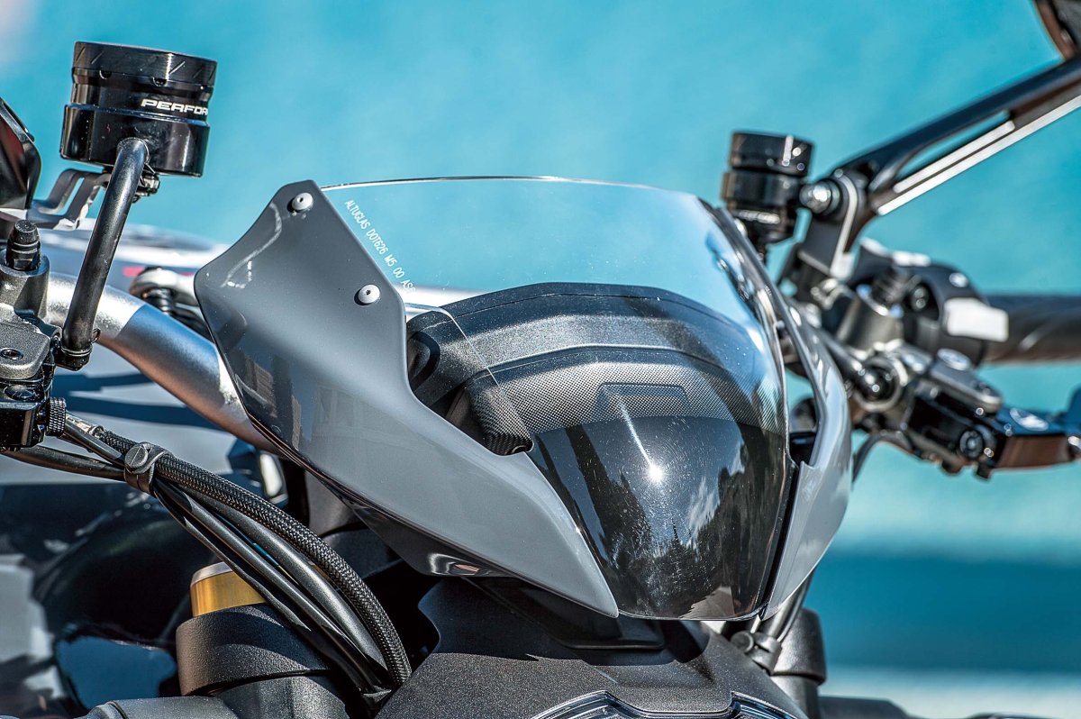 To samo tyczy się systemu kontroli trakcji i wheelie control. Nie musimy ich całkowicie wyłączać, żeby spontanicznie postawić motocykl na tylne koło. Dopóki będziemy mieli przyczepność, komputer nie zaingeruje. Wyjątkiem jest sytuacja, kiedy na tylnym kole chcemy pokonać zakręt. Pochylając motocykl, korzystamy z części opony, której średnica jest mniejsza niż na środku. Wtedy komputer myśli, że to uślizg i obniża lekko moc. Umówmy się, że jest to dość nietypowa sytuacja i dzięki temu dajemy nowe zajęcie osobom odpowiedzialnym za ten system.