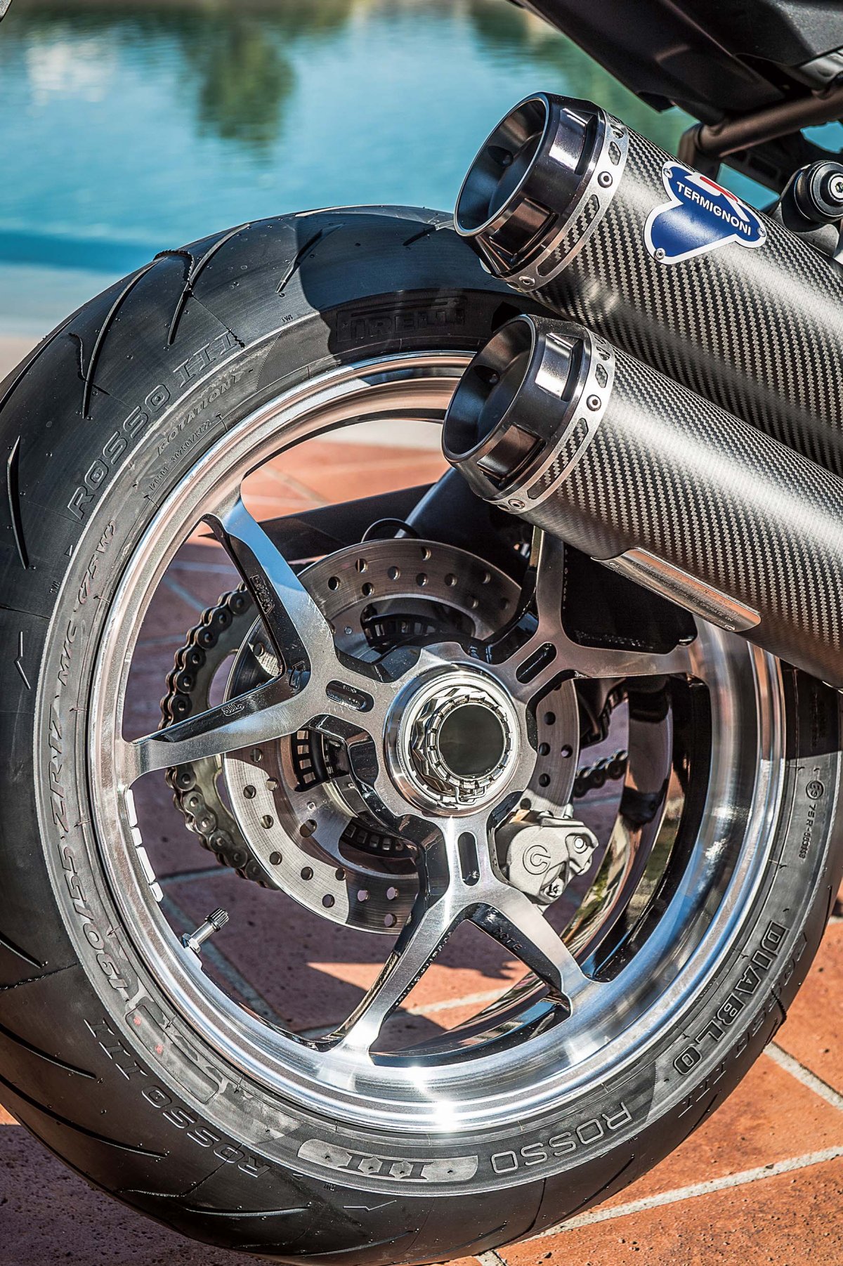 Fot. powyżej: błysk akcesoryjnej felgi komponuje się z karbonowymi dodatkami i złotym zawieszeniem. Wszystkie te gadżety przygotowano dla osób, które uważają, że seryjny Monster nie jest wystarczająco szpanerski.