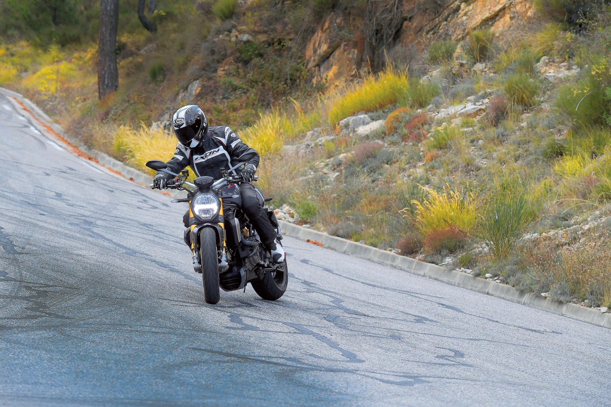 Po opuszczeniu hotelu ogrom różnicy pomiędzy Monsterem nowym a starym uderzył mnie w twarz. Nie był to jednak typowy dla Ducati sierpowy w stylu Rocky Balboa, a zmanierowany liść, zwany „dezorientującym”. Nigdy jeszcze nie jechałem na „Dukacie”, który by tak łagodnie oddawał moc. Zero szarpania czy gaśnięcia na zbyt niskich obrotach. Do tej pory przy zawracaniu czy jeździe w ciasnych uliczkach musieliśmy posiłkować się półsprzęgłem. Teraz turlamy się z prędkością niemal zerową, dodajemy lekko gazu i po prostu odjeżdżamy.