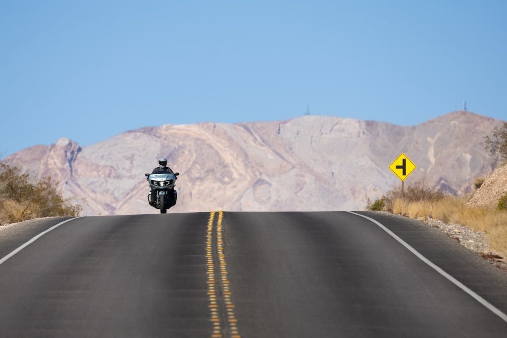 Challenger podczas wspomnianej wcześniej wycieczki do Szwajcarii, nie zatracił swojej amerykańskości nie tylko w silniku, ale także w prowadzeniu. Jak nietrudno się domyślić, że ta ogromna stabilność, przekłada się też na charakterystykę prowadzenia, która jest niesamowicie łagodna. Challenger nie chce skakać z ucha na ucho, nie chce dopadać zakrętów z brawurą. Gdy tego próbujesz, on szybko odwdzięcza się próbą zbyt szerokiego wychodzenia z zakrętów i lekką opornością. Tak, jak by dawał Ci znać, że potrafi, ale to nie tędy droga, że nie masz być narwany, tylko się zrelaksować i czerpać radość z jazdy bez pośpiechu. Oczywiście da się go zmusić do zacieśnienia zakrętu, da się pojechać dynamicznie, ale ma to bardzo siłowy charakter i po prostu nie chcesz tego robić. Natomiast gdy uspokoisz nieco tempo, poprowadzisz płynnie, to jazda staje się przyjemnie naturalna i intuicyjna, a co ważne, pojawia się przestrzeń na podziwianie widoków, których akurat w wielu amerykańskich stanach jest pełno na każdym kroku. Uczciwie muszę przyznać, że choć prowadzenie Challengera jest łatwiejsze, niż mogłoby się początkowo wydawać po doświadczeniach z tego typu motocyklami, to nadal jest ukształtowane przede wszystkim przez specyfikę amerykańskich dróg. Czyli takie, na których zakręt spotykasz raz na 20 mil i zazwyczaj ma on taką formę, że to samo pochylenie możesz utrzymywać przez kolejne pół mili. I na takich drogach, nie wyobrażam sobie motocykla innego typu niż amerykański Bagger. Tutaj rzeczywiście ma to sens i w Dolinie Ognia za sterami Challengera czułem się jakbym grał w filmie drogi. Lub przynajmniej oglądał seans na żywo i to w miejscu VIP, bo takiej wygody podróżowania nie spotyka się często w motocyklach. Choć uczciwie przyznać trzeba, że jest to wygoda dość niecodzienna, bo działająca do ok. 140 km/h. Ogromna owiewka świetnie chroni przed wiatrem, natomiast jedynie do tej prędkości. I nie zmienia sytuacji elektrycznie regulowana szyba, jedynie wyższa, akcesoryjna mogłaby pomóc, chociaż… nie wiem, czy akurat jest to motocykl, którym chce się jeździć szybciej niż 140-150 km/h. Przy takim klimacie po prostu czujesz się źle robiąc takie rzeczy.