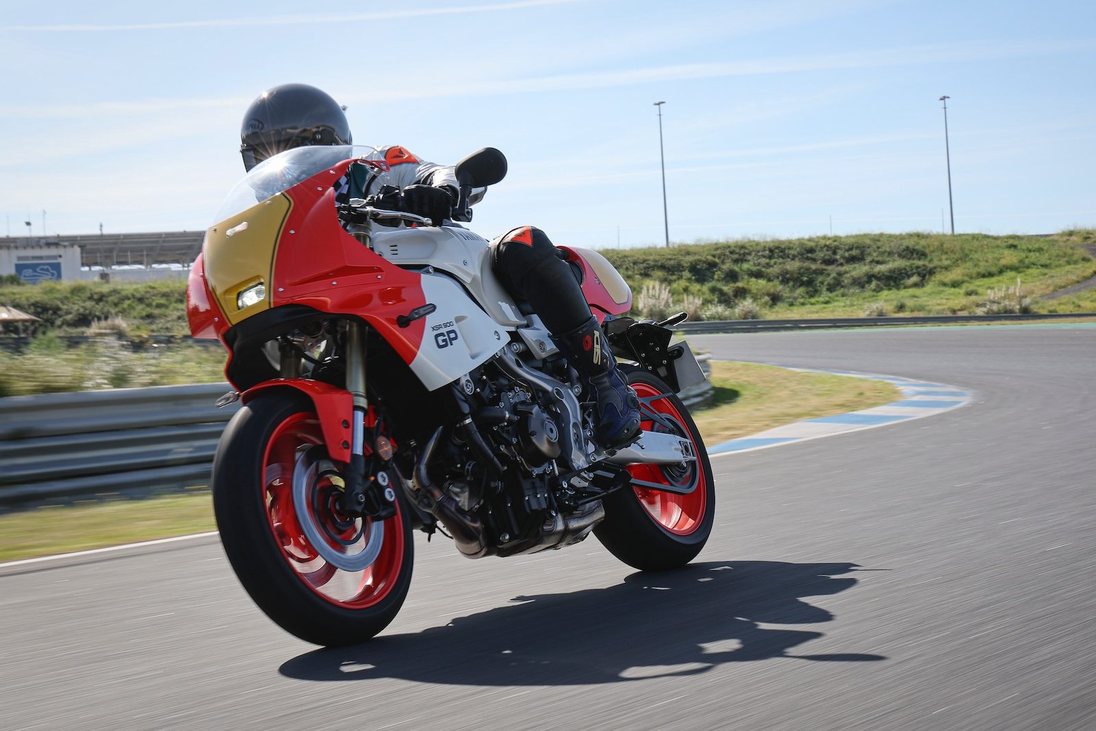 Yamaha stanowczo głosi, że XSR 900GP nie jest motocyklem sportowym, czy też torowym. Dlatego pierwszy punkt foto, mieliśmy na torze Estoril w Portugalii. Co prawda nie jeździliśmy pełnej pętli i nie mierzyliśmy czasów, ale co pojeździłem to moje. A wrażenia są takie, że Yamaha jednak dość skromnie podchodzi do XSR 900 GP. Owszem, w dzisiejszym rozumieniu, nie jest to supersportowy sprzęt. Jednak biorąc pod uwagę klimat GP i okres, do jakiego nawiązuje, to patrzy się na niego inaczej. Stawiam zresztą dolary przeciwko orzechom, że XSR 900 GP złoiłaby niejednego sporta z lat 90. Nie przesadnie, ale jednak wysoko umieszczone podnóżki, pochylona pozycja i dobrze zestrojone podwozie, dają efekt zbliżony do jazdy starym sportem. Jest w tym prowadzeniu trochę sztywności sprzed lat. Dać jeszcze odrobinkę sztywniejszą ramę, zużyć trochę olej w zawieszeniu, tak żeby tył pompował na wyjściach z zakrętów i mamy niedoskonałości starych sportów. Dla mnie, jako człowieka traktującego jazdę po torze stricte rekreacyjnie (czytaj: trochę kaleczę), 900 GP jest przyjemną zabawką na takim obiekcie. I rzeczywiście, prowadzenie tej Yamahy ma w sobie cząstkę retro klimatu. Z silnikiem ocena nie jest już tak jednoznaczna. Bo owszem, brzmienie jest nieco brudne, gardłowe, jak w starych, rzędowych czwórkach, dopiero na górze słychać, że jest o jeden gar mniej. Osiągi też są rozwijane podobnie, czyli dość mocny, ale nieco leniwy dół, środek silny momentem, ale takim wyciągniętym z trzewi i stanowcze przejście w wysokie obroty, na których dzieje się wszystko na raz. Klimat więc jest, z tą różnicą, że silnik CP3 bardzo lekko wkręca się na obroty. No i sam fakt, że jest to rzędowa trójka, a nie czwórka generuje pewne różnice.