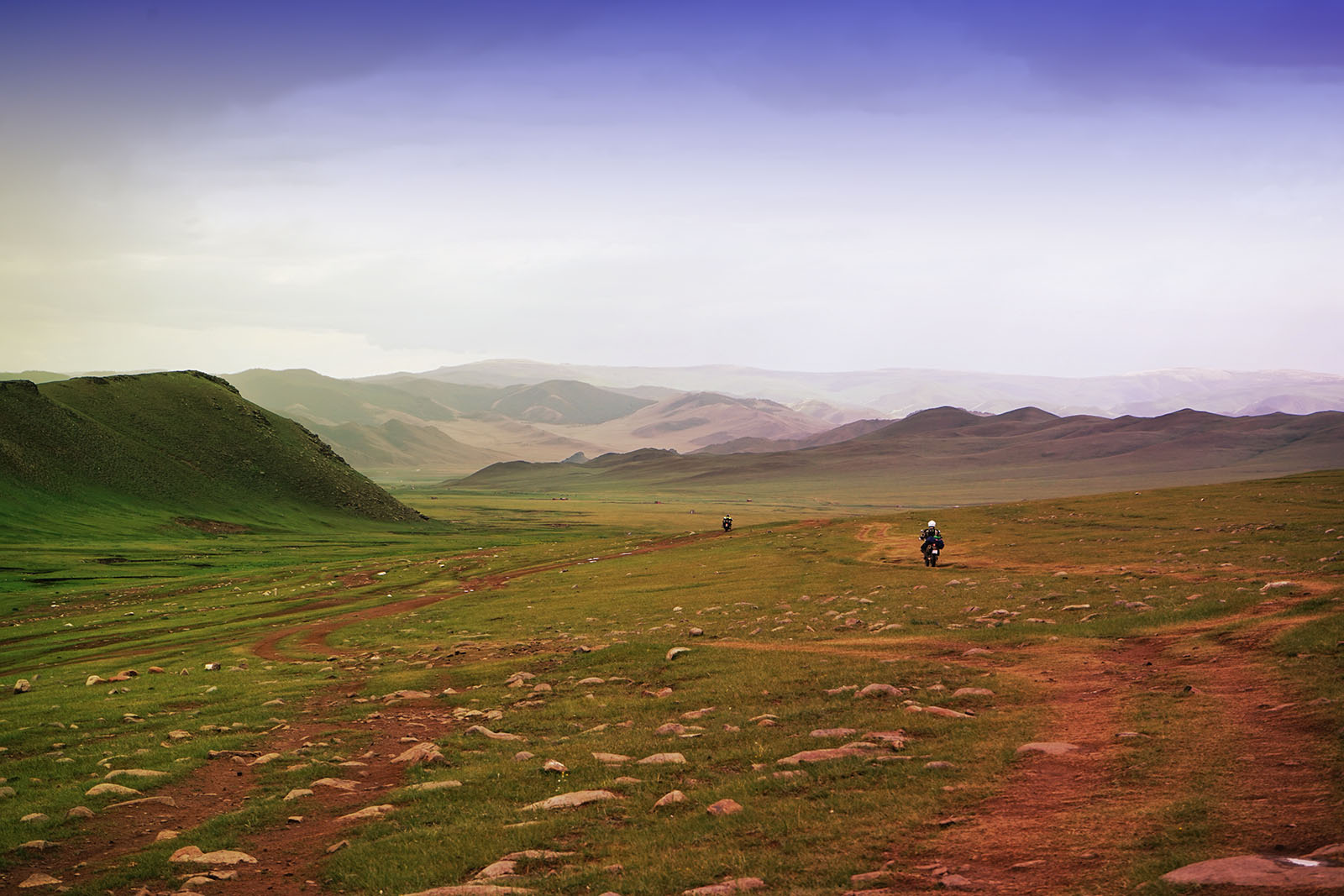 Pierwszy nocleg zrobiliśmy na stepie. Następnego dnia jedziemy drogą międzynarodową tylko z nazwy, to zwykła szutrówka. Mijamy na niej stada jaków i pierwsze Ovo – miejsce kultu. Może być ono czymkolwiek: kupką kamieni lub jak w tym przypadku, samotnym drzewem. Po kilkudziesięciu kilometrach dojeżdżamy do rzeki, gdzie musimy się asekurować podczas przeprawy. Woda ma poniżej metra, ale to wystarczy, żeby przy wywrotce zalać silnik, a to dopiero początek wycieczki. Asystują nam tubylcy, którzy od czasu do czasu ostentacyjnie pokonują rzekę na koniach, pokazując nam „białasom”, jak to się robi. Dalej jechaliśmy przez rozległy płaskowyż, a krajobraz i klimat robiły się coraz bardziej pustynne. Temperatura przekracza 30°, na horyzoncie widać góry i trafiają się pierwsze fatamorgany. Jedziemy i jedziemy, a góry nic się nie przybliżają. Następuje weryfikacja moich doświadczeń: Mongolia jest tak pusta, a powietrze czyste i suche, że to co wydaje się być w odległości 30 km, jest znacznie dalej. Po południu osiągamy podnóże gór, krótkie spojrzenie na licznik – 150 km przez płaskowyż, teraz jeszcze kilkadziesiąt przez góry i nocleg w jurtach nad jeziorem. Wieczorem powtórka z mongolskiej pogody: zrywa się wiatr, szybko spada temperatura i tak zazwyczaj to wygląda. Za dnia ukrop, wargi pękają od słońca i suchego powietrza, kask klei się do głowy, a wieczorem wiatr i takie ochłodzenie, że piwo podgrzewamy na kuchence aby się rozgrzać.