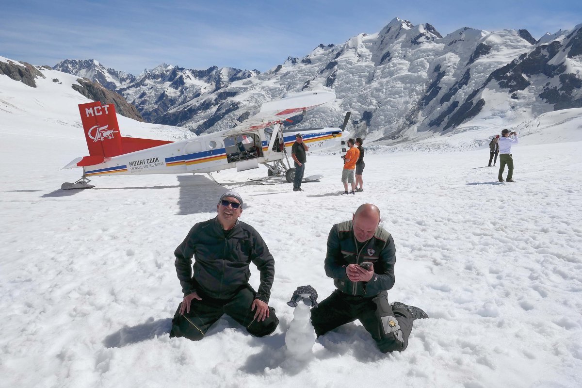 Fot. powyżej: Lodowiec na Mt. Cook. Bałwanek jest dla Jaśka – andrzejowego wnuczka.