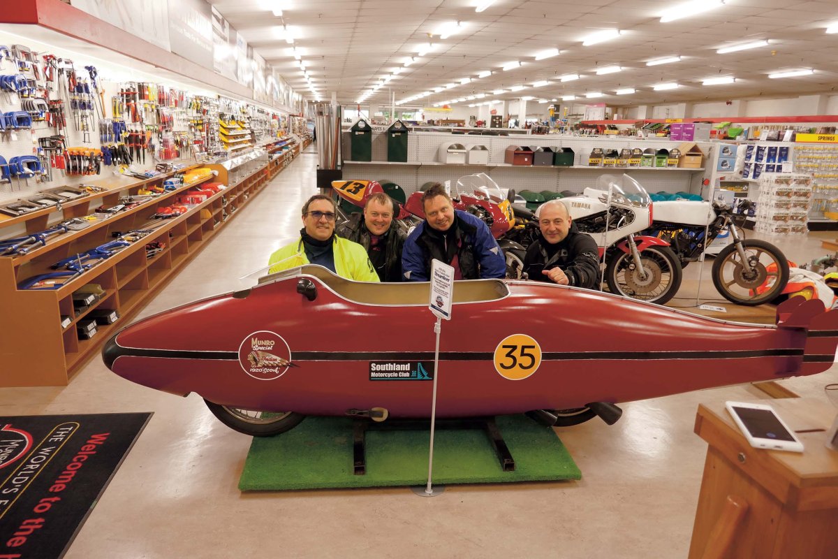 Na stacji benzynowej w Invercargill dostaliśmy wskazówki, jak dojechać tam, gdzie jest to, co w miasteczku najważniejsze. I Nowa Zelandia znowu nas zaskoczyła. Bo zdziwiłby się ten, kto szukałby muzeum Burta Munro. W centrum jest po prostu duży sklep Ehayes, gdzie jest wszystko, od kosmetyków po sprzęt farmerski. Są tam i pamiątki po Munro, które służą za wystrój wnętrza i stałą ekspozycję, w tym Indiany Munro i część jego warsztatu (a także inne zabytkowe samochody i motocykle). Obok „zagablotowanych” maszyn stoją repliki modeli, którymi bił rekordy prędkości. W jednej można wręcz zająć miejsce i poczuć się jak sama legenda. Cóż, niektórym trudno było się zmieścić… Koszt wizyty w sklepie – muzeum to zakup biletu w ulicznym parkometrze. Godzina może być za mało. Oczywiście są pamiątki: koszulki, kubeczki, plakaty, książki.