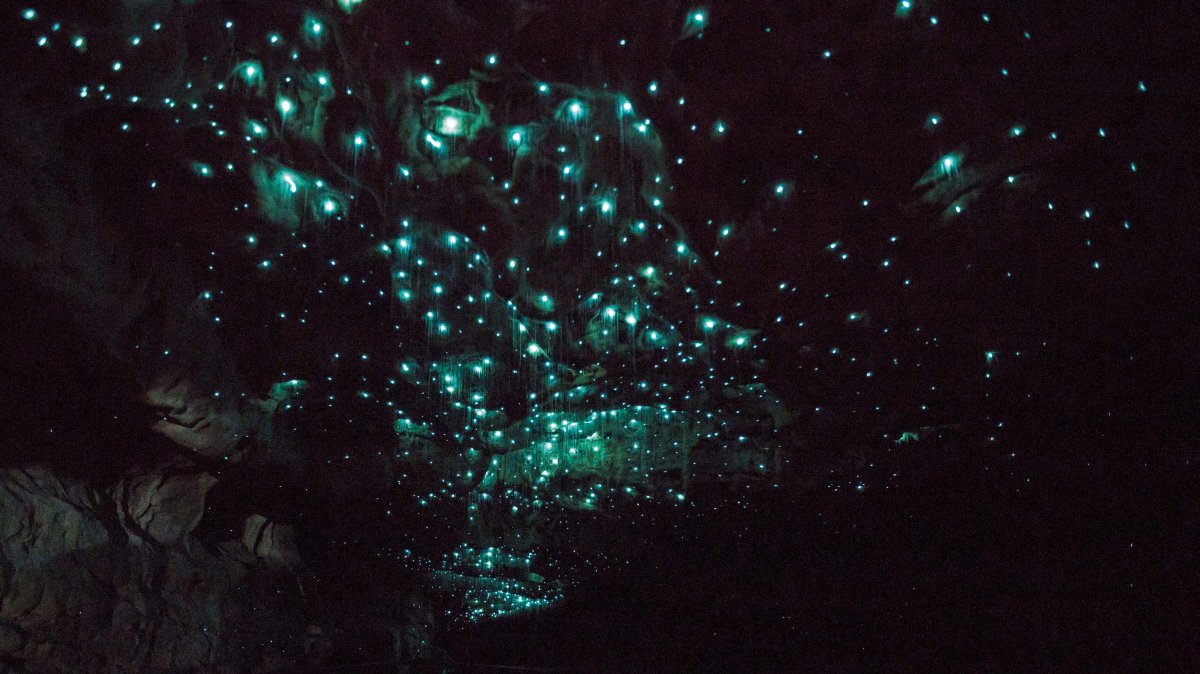 Została nam jeszcze jedna pozycja z listy „chcemy zobaczyć” – świecące robaczki. W zasadzie świeci wydzielina larw. Zwabia inne owady, które stają się ich posiłkiem. Lecz można je znaleźć tylko w niektórych jaskiniach. Zagłębiem tych miejsc są okolice Waitomo. Do zwiedzania udostępniono kilka jaskiń. Opłata jest zależna od opcji zwiedzania i fotografowania. Próbowaliśmy zobaczyć to dziwo jeszcze na Wyspie Południowej, lecz tam – bez powodzenia. Tu początkowo też wydawało się, że wtopiliśmy, lecz na koniec zeszliśmy do podziemnej rzeki. W ciemnościach wsiedliśmy na łódkę i… Ukazało się nam sklepienie usiane jasnoniebiesko punkcikami – jak pod rozgwieżdżonym niebem! Niesamowite wrażenie.