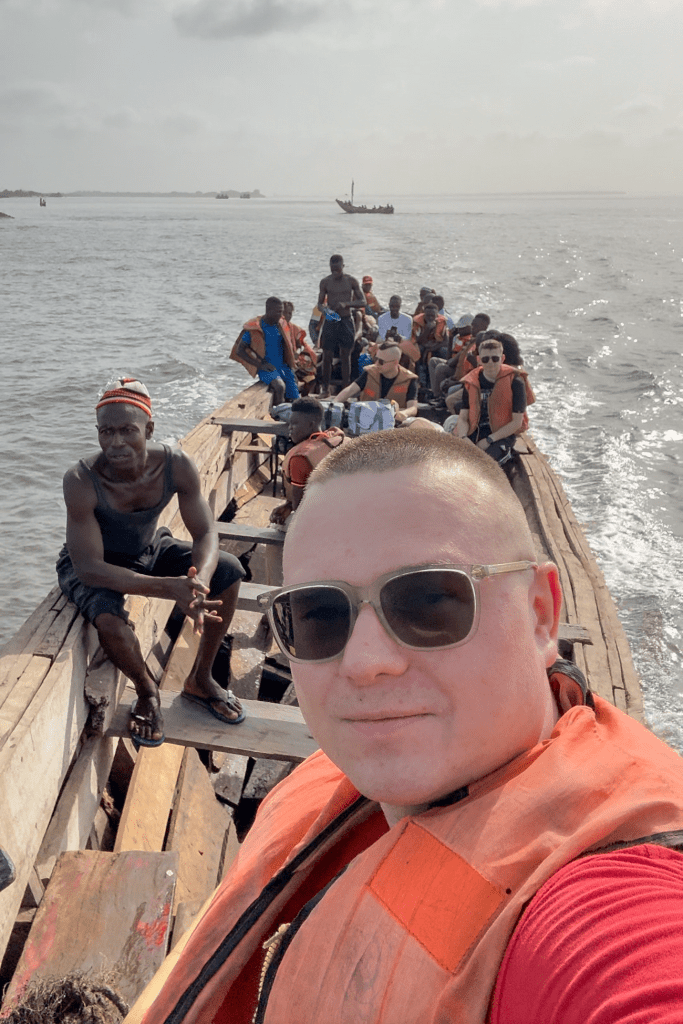 Nieco zdesperowani zaczęliśmy szukać innego transportu i znaleźliśmy prywatną łódź. Po wynegocjowaniu ceny (…?) tragarze postanowili przenieść nas na rękach na tę łódź, żebyśmy nie musieli się moczyć w wodzie. Lecz później za tę usługę chcieli od nas dodatkowej zapłaty, chociaż miało to być zawarte w cenie. Dla świętego spokoju daliśmy im na colę, bo inaczej nie daliby nam spokoju. Tak w Afryce się goli białych frajerów…