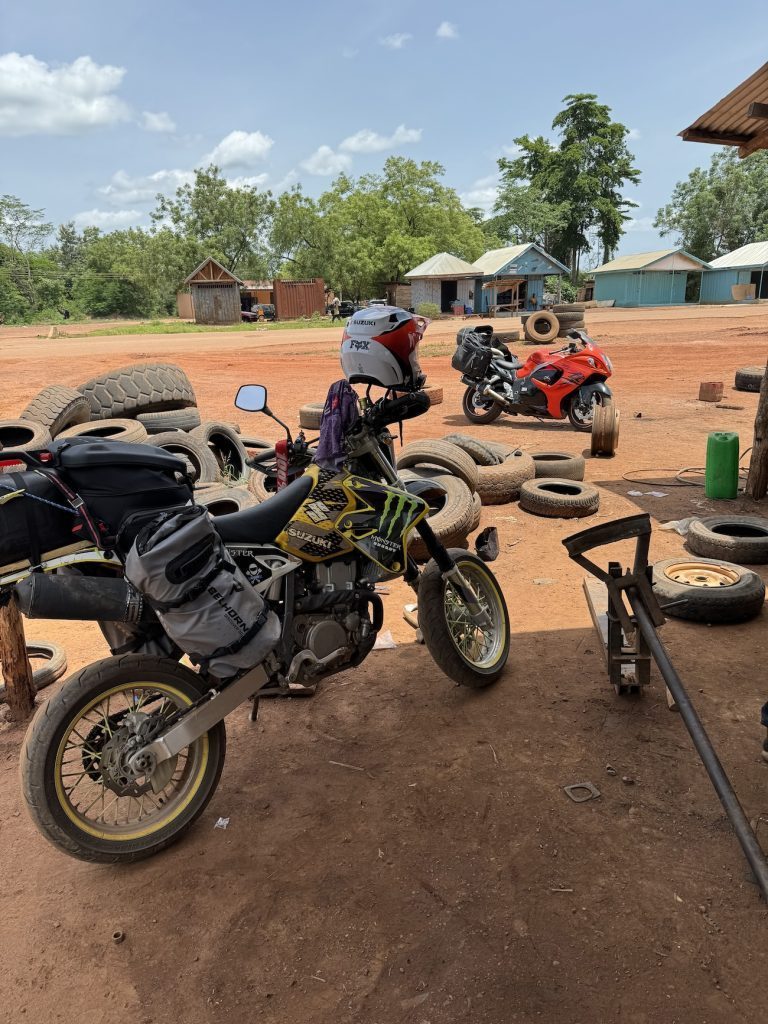 Ghana nas zaskoczyła pod względem kulturowym, ponieważ w poprzednich państwach mieliśmy złe doświadczenia z ludźmi, gdzie na każdym kroku i za byle pomoc chcieli wyłudzić pieniądze. W tym państwie było zupełnie inaczej – ludzie byli bardziej życzliwi i bezinteresowni. Na jednym z postojów zauważyliśmy, że Hajka ma gwoździa w oponie. Temat załatwił przydrożny wulkanizator, który usunął nieproszonego pasażera na gapę, a dziura załatana została zestawem naprawczym. W DRZ naliczyłem 4 gwoździe, ale ze względu na fakt, że opony są dętkowe, a powietrze nie schodziło, to je zostawiłem na pamiątkę. Po drodze natknęliśmy się na myjnię, gdzie dokładnie i starannie pracownicy umyli mój totalnie brudny motocykl za równowartość 2 zł. Przy okazji w tej cenie umyte zostały też moje buty.