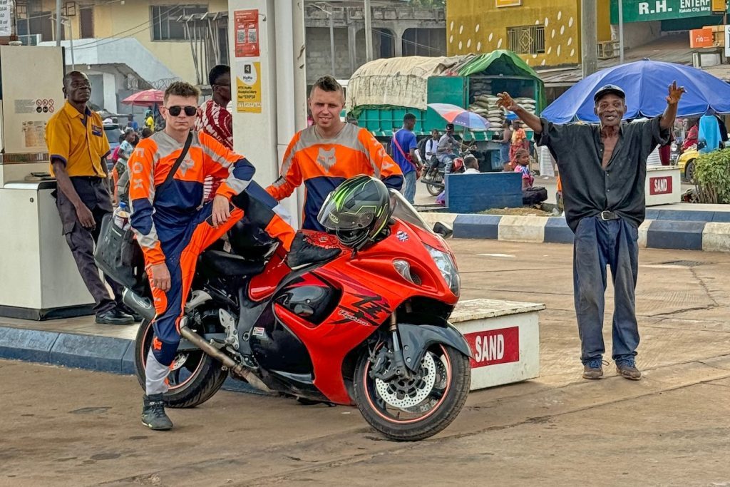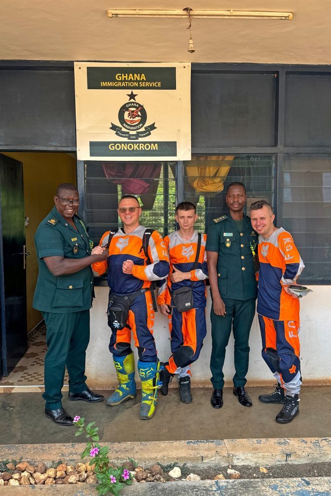 Kolejnym państwem na trasie była Ghana. Na przejściu granicznym służba koniecznie chciała zrobić sobie z nami pamiątkowe zdjęcie – byliśmy dla nich bardzo egzotyczni. Nawet dostaliśmy numer telefonu od szefa przejścia, by w razie czego dzwonić do niego, a on nam pomoże (całe szczęście użycie tego numeru nie było konieczne) w trudnych momentach. Tu miała miejsce jeszcze jedna, dość dziwna sytuacja. Po załatwieniu wszystkich niezbędnych formalności pogranicznicy kazali nam udać się do jeszcze jednego stanowiska i podczas spisywania naszych danych z paszportów naradzali się, ile od nas skasować za jakąś dodatkową opłatę. Natomiast my powiedzieliśmy, że nie mamy pieniędzy, a Robert Lewandowski im zapłaci (Roberta tu wszyscy znają). Tym sposobem uniknęliśmy tej lewej opłaty. Jest nadzieja, że nie będą chcieli egzekwować należności od naszego najsłynniejszego piłkarza.