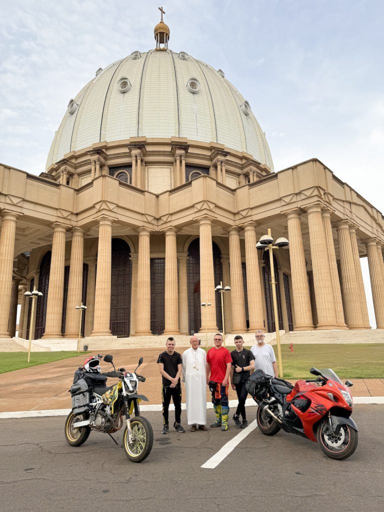 Kolejnym przystankiem na naszej trasie było spotkanie z polskimi księżmi pallotynami (ks. Cezary oraz ks. Zenon) w Bazylice Matki Bożej Królowej Pokoju w Jamusukro, którzy opiekowali się tym świętym miejscem. Oprowadzili nas oraz opowiedzieli historię tej budowli, która dzierży kilka rekordów. Jest największym kościołem na świecie, najwyższą świątynią w Afryce i najwyższym kościołem katolickim na świecie. Wygląda rzeczywiście imponująco. Co ciekawe, gdy w roku 1983 prezydent Wybrzeża Kości Słoniowej (uzyskało niepodległość w roku 1960) wybrał Jamusukro na stolicę państwa, od razu w projekcie miasta przewidziano tę właśnie budowlę. Tu nasze motocykle zostały poświęcone przed dalszą podróżą, a ja miałem okazję posługi ceremonialnej jako ministrant. Ks. Cezary i ks. Zenon bardzo cieszyli się wizytą rodaków przybyłych z tak daleka.