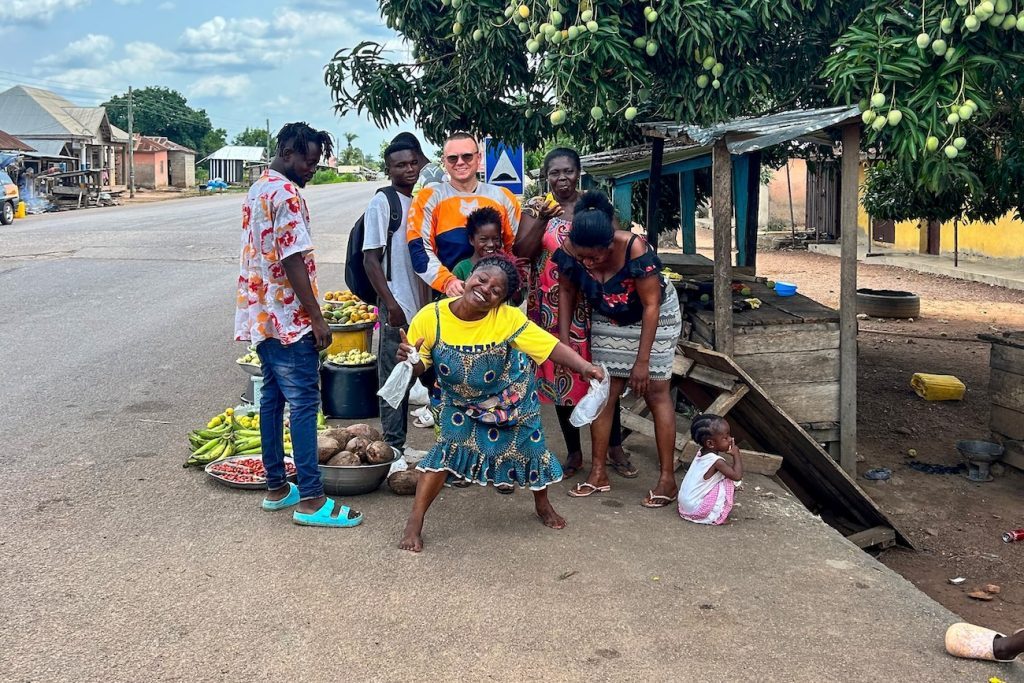 Na lokalnym przydrożnym straganie z owocami i warzywami w Ghanie ludzie mimo, że żyją skromnie niemal zawsze są życzliwi i uśmiechnięci.