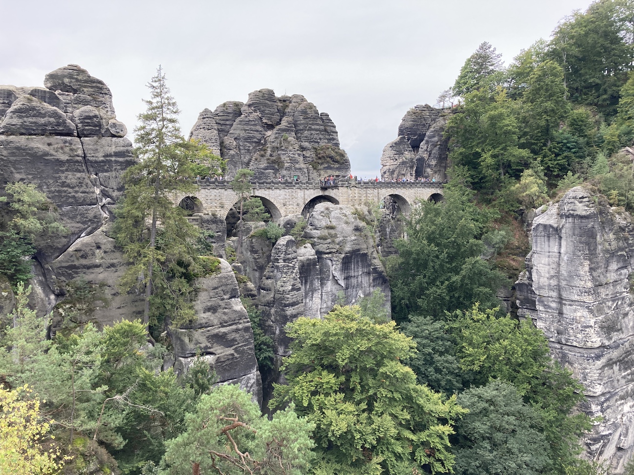 Naszym głównym celem na ten dzień jest słynny kamienny most Basteibrücke, znany również pod angielską nazwą Bastion Bridge, wraz z położonymi tuż obok pozostałościami średniowiecznego zamku Neurathen, zlokalizowanymi na pionowych skalnych kolumnach. Początkowo podjeżdżamy tam od południa, od rzeki Łaby i miejscowości Rathen. Szybko się jednak stamtąd wycofujemy, ponieważ ruch kołowy w miasteczku jest dozwolony tylko dla mieszkańców, ponadto czekałoby nas długie i strome podejście – przy naszej kondycji i w motocyklowych ciuchach jednak mordercze.