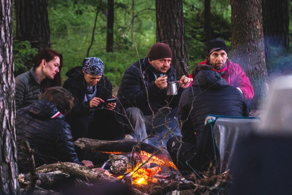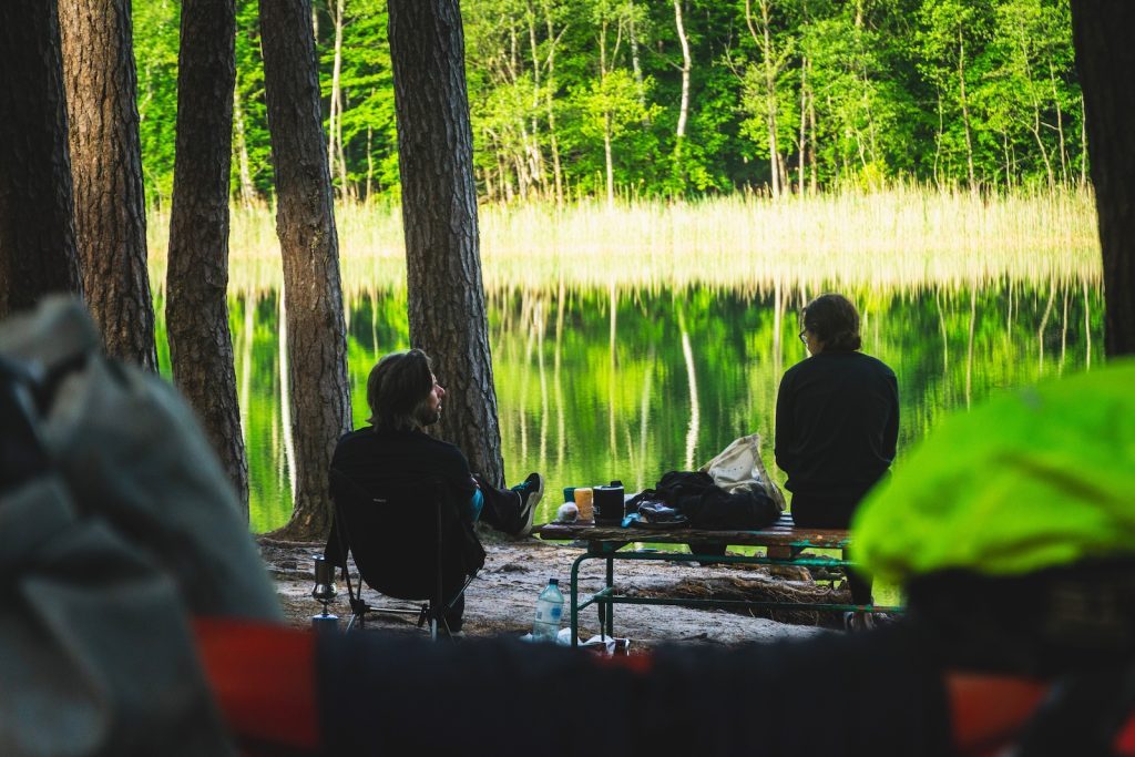 Zwołanie ekipy na wyjazd w Internecie nie zajęło długo. Każdy z uczestników otrzymuje ślad gpx, którym się porusza – w ten sposób naturalnie, z kilkunastoosobowej grupy, wydzielają się małe zespoły o podobnym tempie jazdy. Mijamy się na trasie, widujemy na kawie czy posiłku za dnia. Spotykamy na biwakach (koniecznie nad wodą) pod wieczór, najlepiej zupełnie dzikich. Kolacja na ogniu, toaleta w lesie, higiena w jeziorze lub rzece.