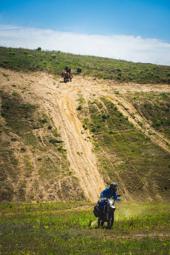 Ponidzie obkleja nasze motocykle błotem o wyjątkowej konsystencji. Do tego kałuże wydają się nie mieć dna. Szczęśliwie po przekroczeniu Wisły gleby robią się piaszczyste, a woda na drodze znika. Niespodziewanie trafiam na ślady harvestera zakończone bagnem, w które udaje mi się koncertowo wkleić. Jadę chwilowo sam, zasięgu w telefonie… brak. Trzeba działać. Sakwy zdjęte, motocykl na bok, wyszarpuję tylne koło z cuchnącej mazi, oganiając się od much. Po kwadransie, motocykl wydobyty, trzeba więc szukać objazdu. Pół godziny później silnik gaśnie ni stąd ni zowąd, na szczęście na skraju wsi. Dziwne – z szybkich obliczeń wynika, że powinienem mieć jeszcze 3l paliwa! Chyba za dobrze się bawię. Szczęśliwie ktoś w garażu ma kanister benzyny. To nie jest dobrze przetarty TET, rozpoznanie trasy „prowadzimy bojem” więc niespodzianek nie brakuje. Zgodnie z przewidywaniami niektóre drogi przejmowane są przez naturę, a ich istnienie robi się dyskusyjne. Szkoda energii i czasu na walkę, agenda wyjazdu zakłada omijanie kłopotów by zdążyć przed zmrokiem, i tak jest się zmęczonym pod wieczór.