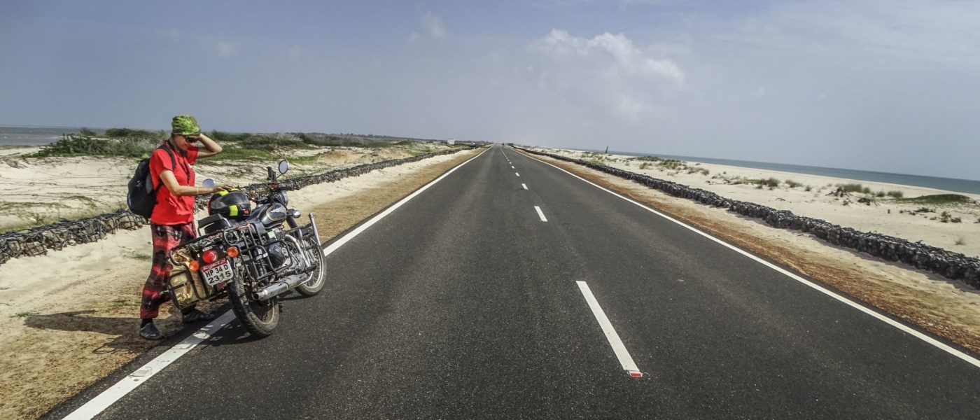 Miejscowość Rameshwaram na Wyspie Pemban to miejsce licznych pielgrzymek, a także punkt wypadowy do odległego o 20 km Danushkodi. W 1964 roku potężne tsunami zmiotło tam z powierzchni ziemi wioskę i stojący w niej pociąg. Dojazd do tego miejsca tkwił w naszych marzeniach od miesięcy. Niestety, 5 km przed Danushkodi drogę zablokował nam szlaban. Tuż za nim nowiuteńka droga czekała na oficjalne otwarcie. Musieliśmy zostawić motocykl i skorzystaliśmy z jednego z bardzo licznych autobusów, które ten odcinek jadą… po plaży. Opłata – 5 dolarów w obie strony, z 90-minutowym postojem na zwiedzanie ruin wioski. Po powrocie na parking ten sam żołnierz poinformował nas, że… możemy jednak jechać! Więc wróciliśmy, mknąc pięknym asfaltem. Po obu stronach jezdni, niemal na wyciągnięcie ręki, było morze. Droga kończy się 10 km dalej, w Arichalmunai. Dalej już tylko cieśnina, niewidoczny z lądu, podwodny Most Adama i oddalony o 30 km brzeg Sri Lanki.
