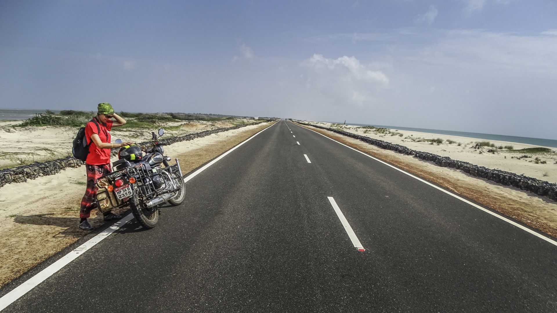 Miejscowość Rameshwaram na Wyspie Pemban to miejsce licznych pielgrzymek, a także punkt wypadowy do odległego o 20 km Danushkodi. W 1964 roku potężne tsunami zmiotło tam z powierzchni ziemi wioskę i stojący w niej pociąg. Dojazd do tego miejsca tkwił w naszych marzeniach od miesięcy. Niestety, 5 km przed Danushkodi drogę zablokował nam szlaban. Tuż za nim nowiuteńka droga czekała na oficjalne otwarcie. Musieliśmy zostawić motocykl i skorzystaliśmy z jednego z bardzo licznych autobusów, które ten odcinek jadą… po plaży. Opłata – 5 dolarów w obie strony, z 90-minutowym postojem na zwiedzanie ruin wioski. Po powrocie na parking ten sam żołnierz poinformował nas, że… możemy jednak jechać! Więc wróciliśmy, mknąc pięknym asfaltem. Po obu stronach jezdni, niemal na wyciągnięcie ręki, było morze. Droga kończy się 10 km dalej, w Arichalmunai. Dalej już tylko cieśnina, niewidoczny z lądu, podwodny Most Adama i oddalony o 30 km brzeg Sri Lanki.