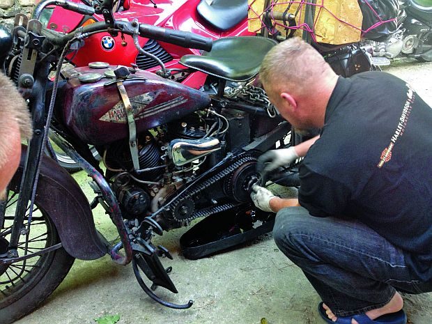 Wraz z Ryśkiem (Harley VLD 1936) przyjechały jeszcze trzy motocykle z Brzegu, prowadzone przez Agnieszkę (Harley VLD 1935), Mariusza (Yamaha Wild Star) i Krzyśka (BMW K100). Potem dotarł jeszcze Marcin (Harley VLD 1934) z Warszawy. Dla nich to był pierwszy nocleg w trasie. Co się robi po przejechaniu czterystu kilometrów na Harleyu VLD z 1936 roku? Pije się piwo? Tak jest zazwyczaj, ale tym razem pierwsze miejsce w kolejce zajęła uszkodzona prądnica Ryśka, którą trzeba było usprawnić. Ot, jakieś połączenie, obluzowane prawie osiemdziesięcioma latami wibracji.