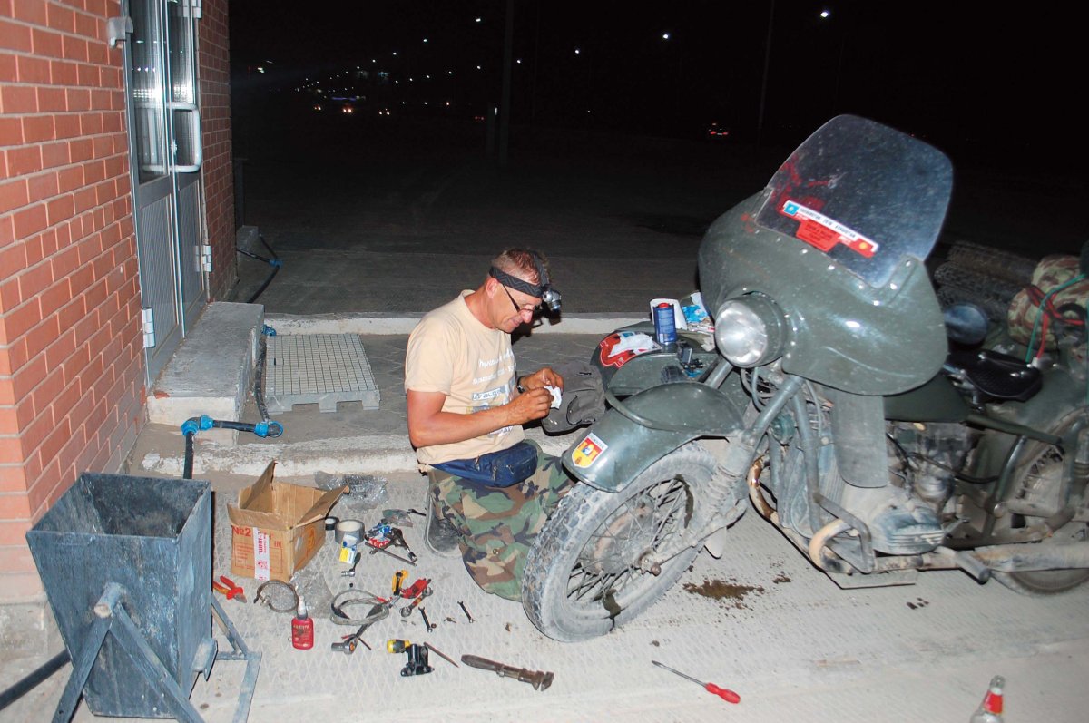 Jeszcze w Polsce Wojtek pierwszy raz w życiu złapał kapcia w przyczepce. Ledwie wjechał do Kazachstan, ujawniły się problemy ze stykami w rozruszniku. Kolejnego dnia rozkręcał gaźnik. I tak codziennie poświęcał maszynie po 1,5 godziny. Bardzo się tym stresował. Raz nawet pomyślał o zawróceniu z drogi, ale wyprowadzenie odmy gaźnika na zewnątrz pomogło i motor rwał do przodu jak należy. Gdzieś w stepie zawiódł jeszcze wirnik alternatora, lecz drugi znalazł się w koszu na zapasie.