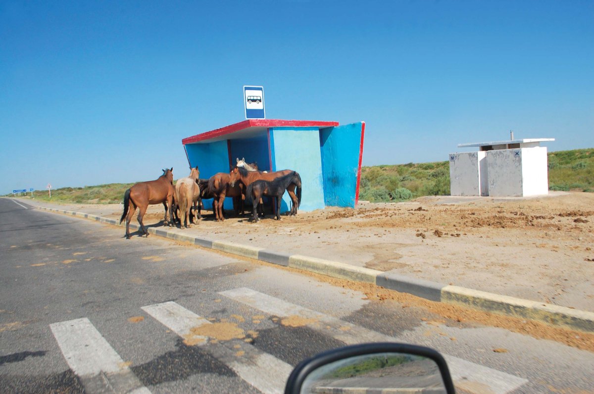 Fot. powyżej: Czekają na autobus…? Nawet dzikie konie szukały skrawka cienia pod wiatą przystanku.