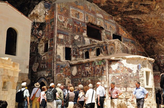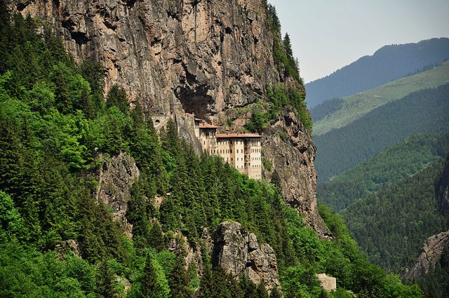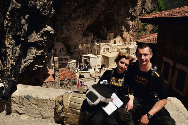 Zespół klasztorny w Sumelas położony jest wysoko w górach i przyklejony do skalnej półki. Już sam dojazd jest wyzwaniem. A sam klasztor? To piękno gór i i ludzkiego kunsztu. Jeszcze nie jest oblegany przez turystów i jest możliwość dojechania bardzo wysoko. Niestety to teren parku, a więc wjazd jest płatny. Białą drogą chcę przeciąć góry za klasztorem, jednak przewodnik zapytany o nią jest wyraźnie zdumiony. My tam jeszcze nie chodzimy, bo jest śnieg, a wy chcecie jechać? Jedziemy na południe bez konkretnego planu na nocleg, ot tak sobie.