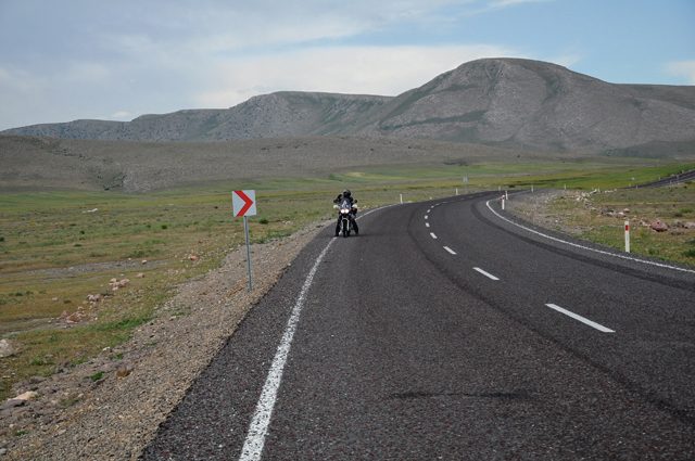W Gümühane skręcamy na boczną drogę w kierunku Erzican. Jest dobrze, winkle i górki, tylko troszkę za ciepło. Przy jednej ze studni spotykamy chłopaka na BMW 1150. Jest Turkiem, ale rozmawiamy po angielsku. Odradza wypady na wschód od drogi, którą jedziemy. Mówi coś o zagrożeniu ze strony terrorystów (miał na myśli chyba Kurdów). Chłopak po pamiątkowej fotce znika, a my wjeżdżamy na kontrolę wojskową, która przebiega bardzo sprawnie. Następuje rozluźnienie i znowu wspólne zdjęcie. Tempera oscyluje w okolicach  350C, a my jesteśmy na wysokości 2150 m n.p.m. Wieczór, zaczynamy się rozglądać za noclegiem. Droga, która jest na mapie kończy się przed mostem, którego nie ma. Wracamy na szutrówkę, która przechodzi w asfalt. Zapada zmrok. Obciążona Africa świeci po koronach drzew. Dopada nas zmęczenie i brak wyczucia odległości. W końcu dojeżdżamy do Divri. W hotelu jemy placek zbożowy (taka duża pizza) i odpływamy. Dziś ujechaliśmy 520 km.